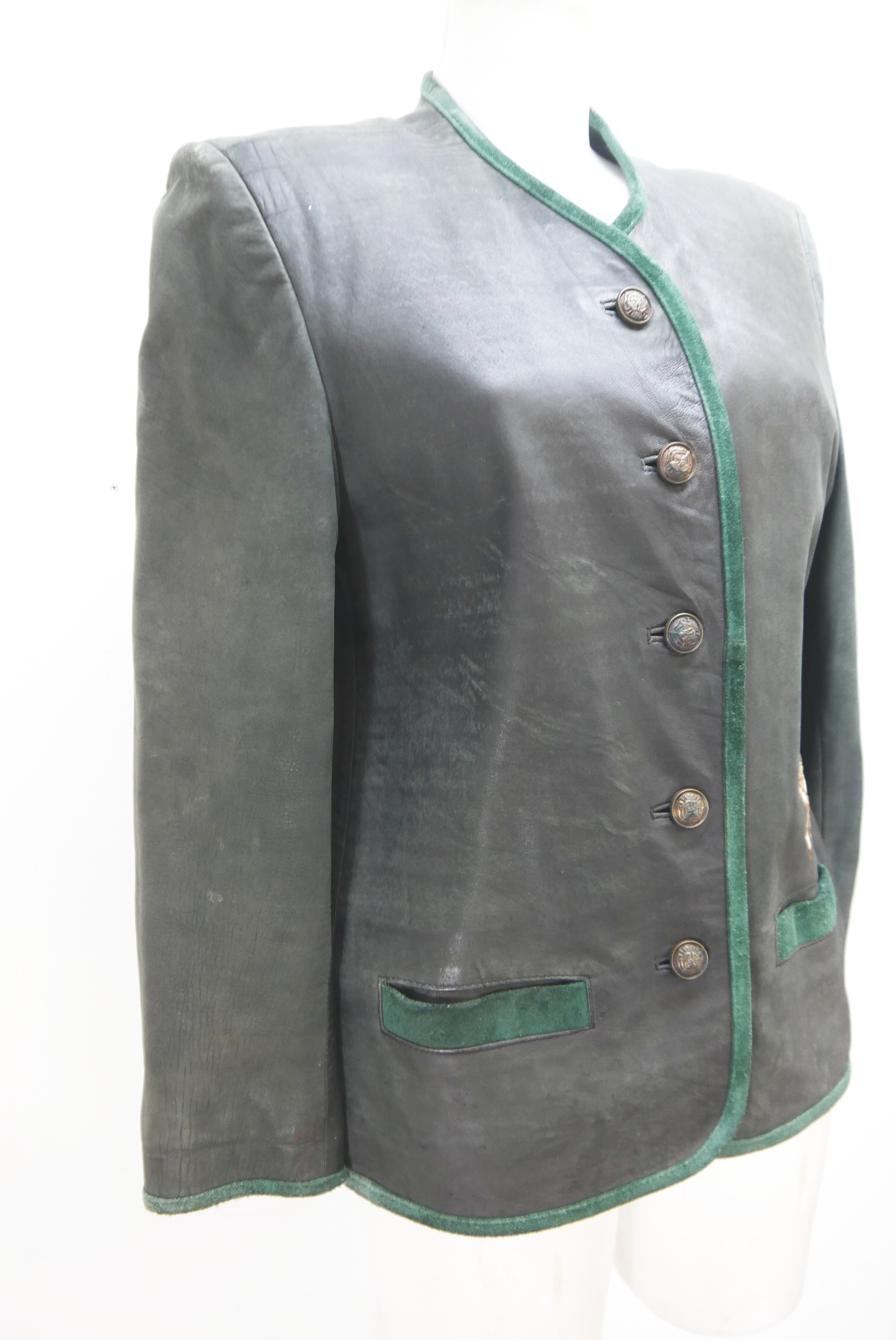 90er Vintage Blazer Trachtenjacke als Lederjacke gerade geschnitten Trachten Janker markenlos aus Glattleder gefertigt in grau anthrazit und leicht verspeckt und verschmutzt, innen gefüttert mit Stickerei verziert als langarm Jacke mit schönen Knöpfen,- wird meistens offen getragen.