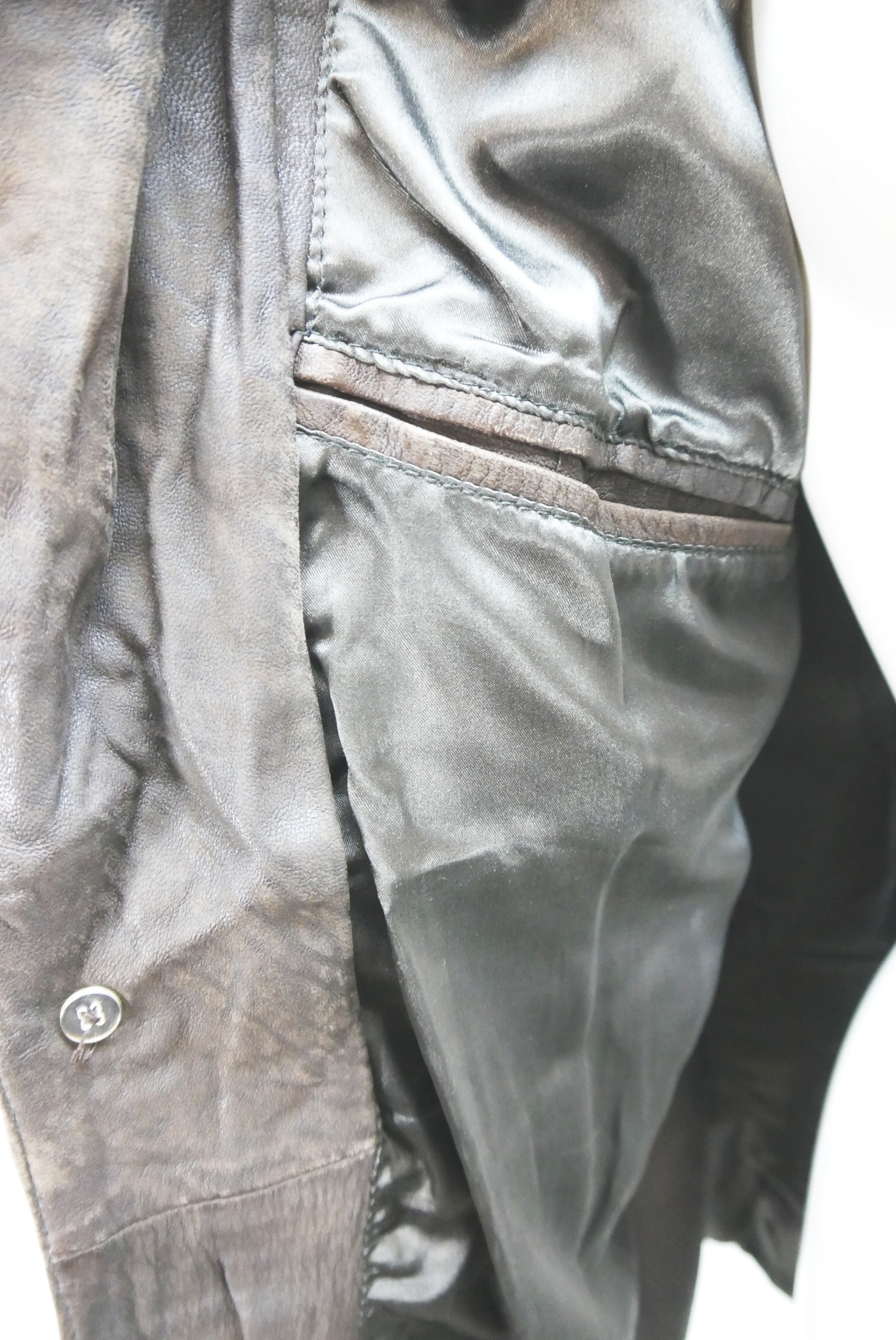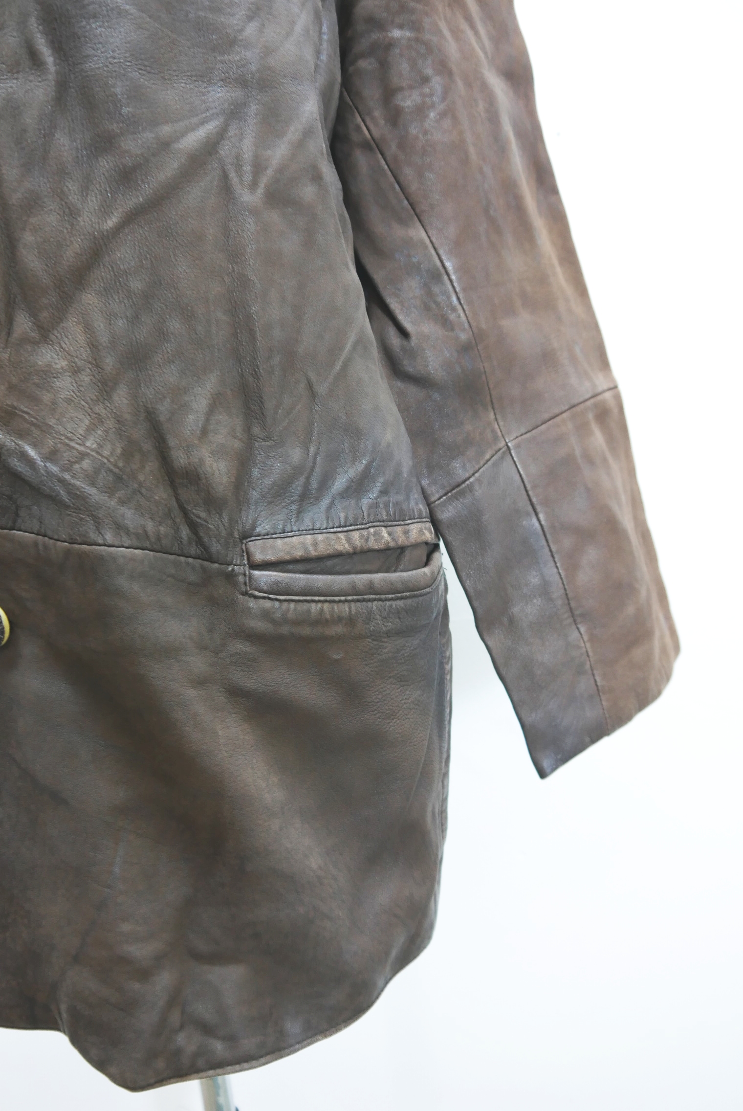 Lässig lange 90er Vintage Lederjacke als Trachtenjacke Janker in guten Zustand weit geschnitten markenlos aus Schafnappa Glattleder gefertigt schön weich in braun und richtig gut verspeckt, innen gefüttert schlicht ohne Verzierungen als langarm Jacke mit klasse Knöpfen, – wird meistens offen getragen.