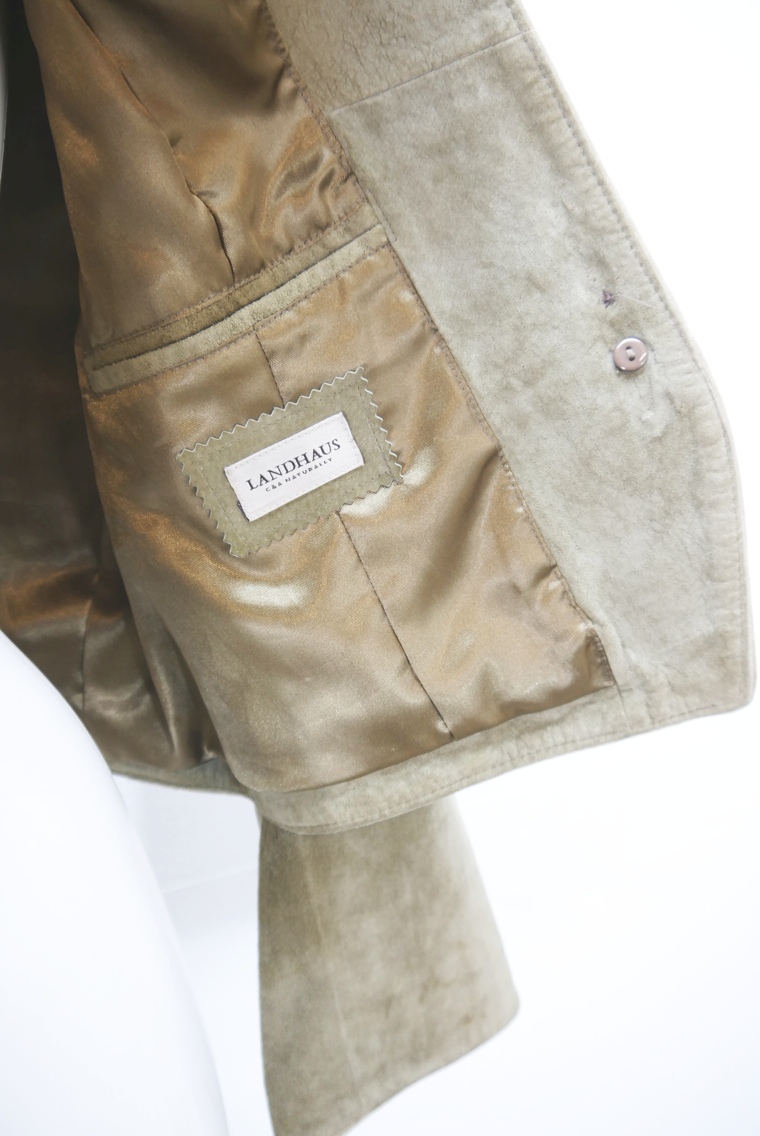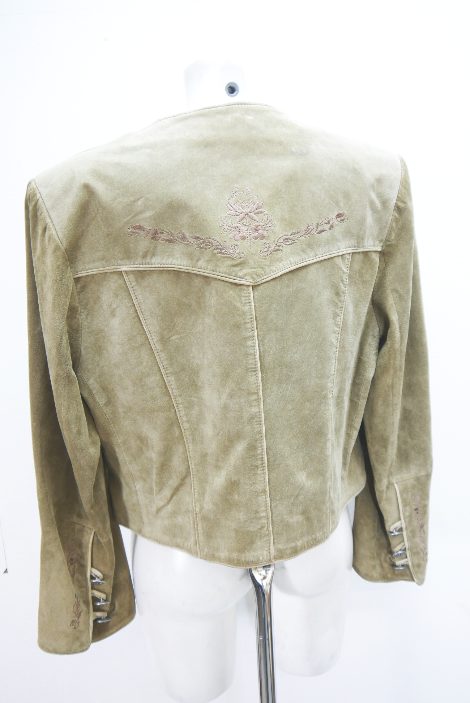 Kurze Vintage Blazer Trachtenjacke in Top Zustand als Lederjacke tailliert geschnitten Trachten Janker von C&A Landhaus aus Wildleder gefertigt in braun und nicht verspeckt, innen gefüttert mit Stickerei verziert als langarm Jacke mit schönen Knöpfen,- wird meistens offen getragen.