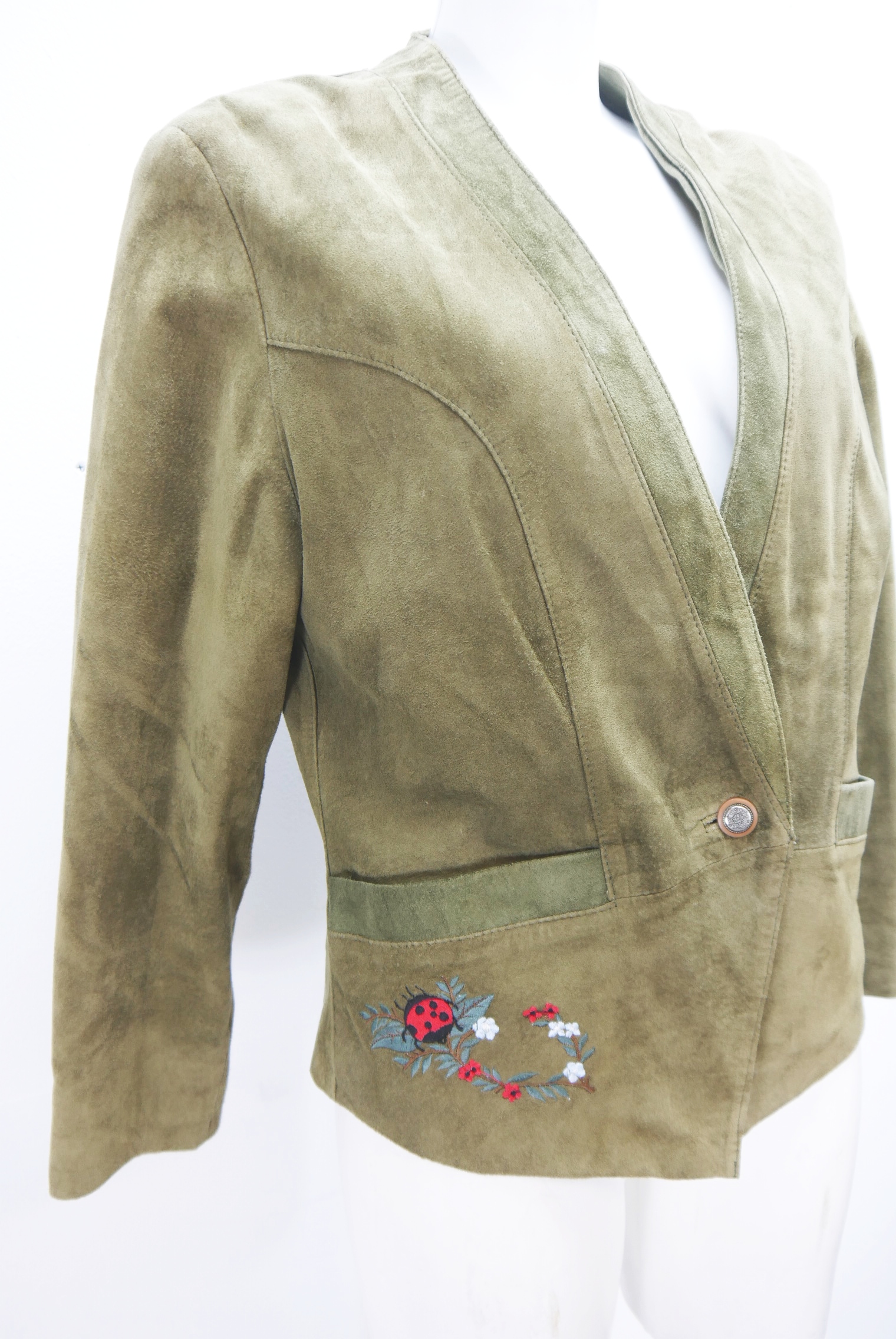 Kurze Vintage Blazer Trachtenjacke in Top Zustand als Lederjacke tailliert geschnitten Trachten Janker von Fair Lady aus Wildleder gefertigt in braun und nicht verspeckt, innen gefüttert mit Stickerei verziert als langarm Jacke mit schönen Knöpfen,- wird meistens offen getragen.