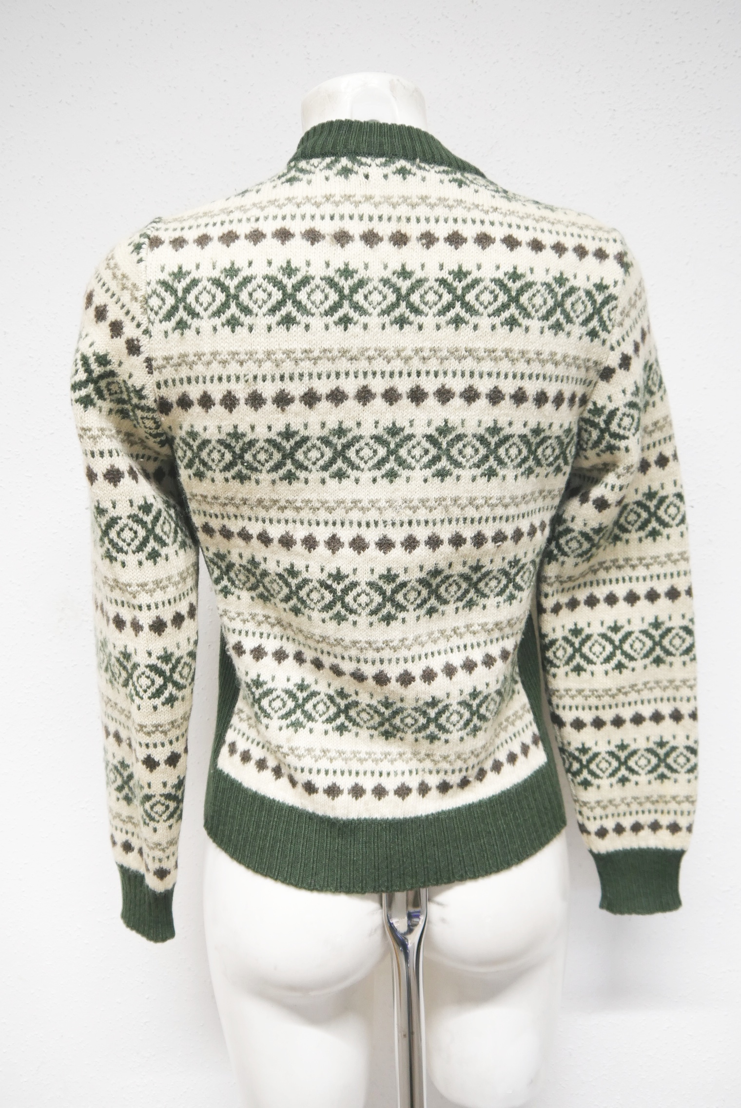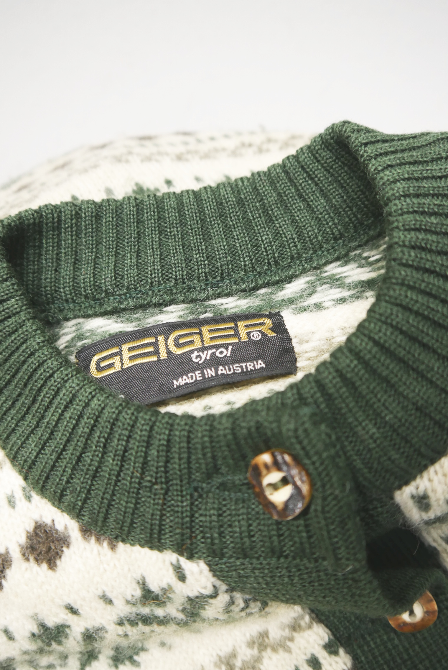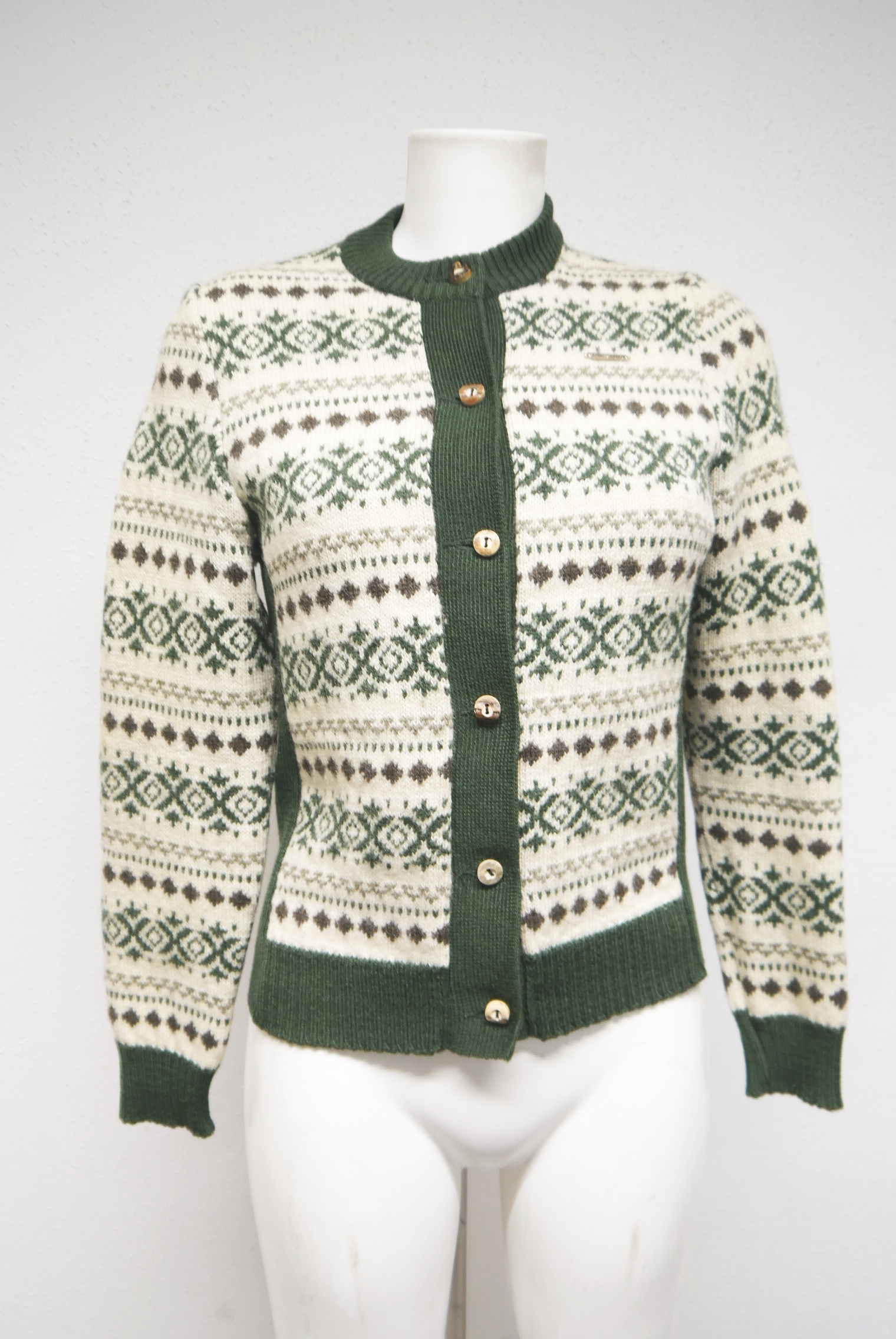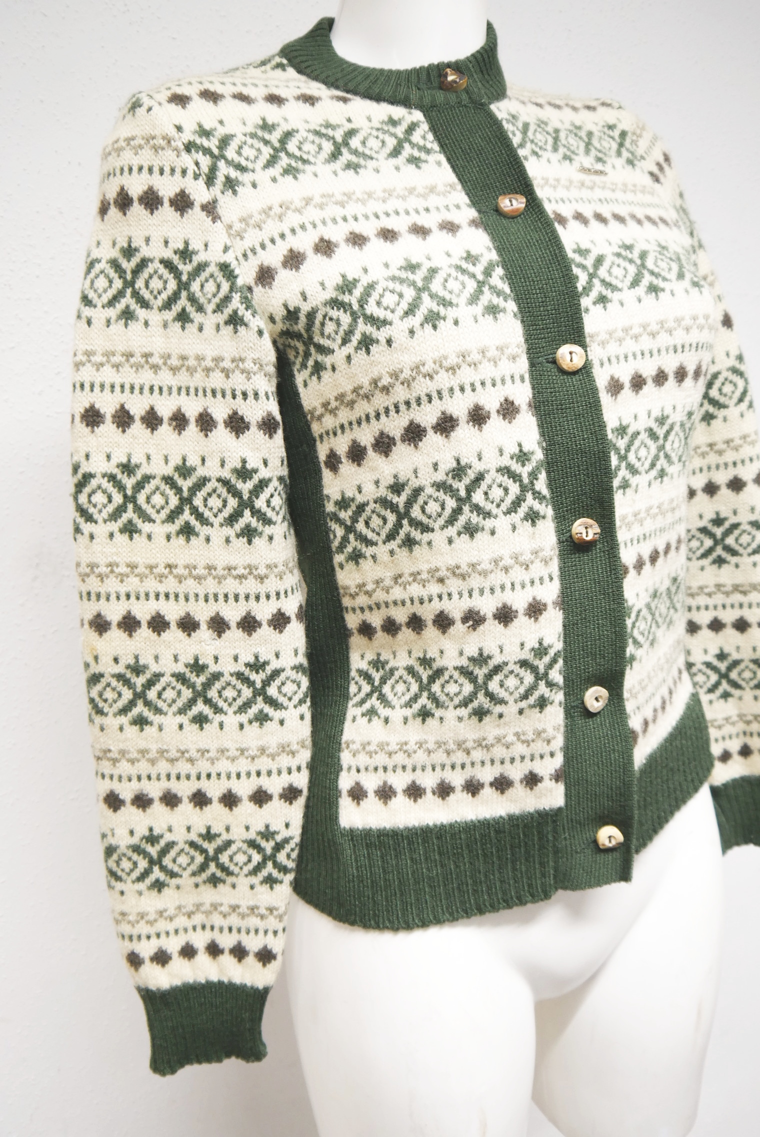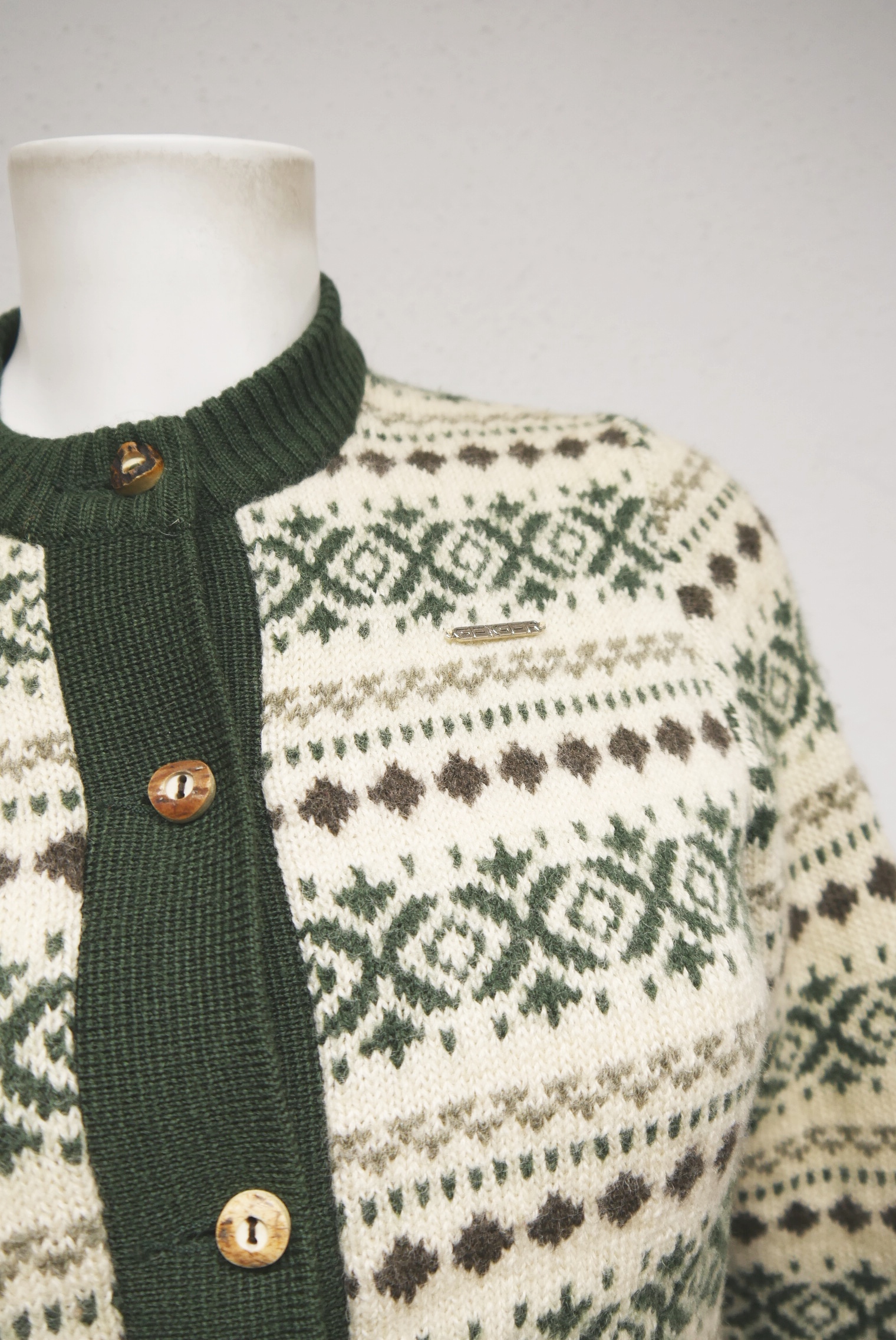 Vintage Damen Norweger Strickjacke neuwertig figurbetonend anliegend warm warm von Geiger aus dicker Schurwolle gestrickt in grün/weiß gemustert modisch zeitlos mit geraden Arm und echten Hirschhornknöpfen.