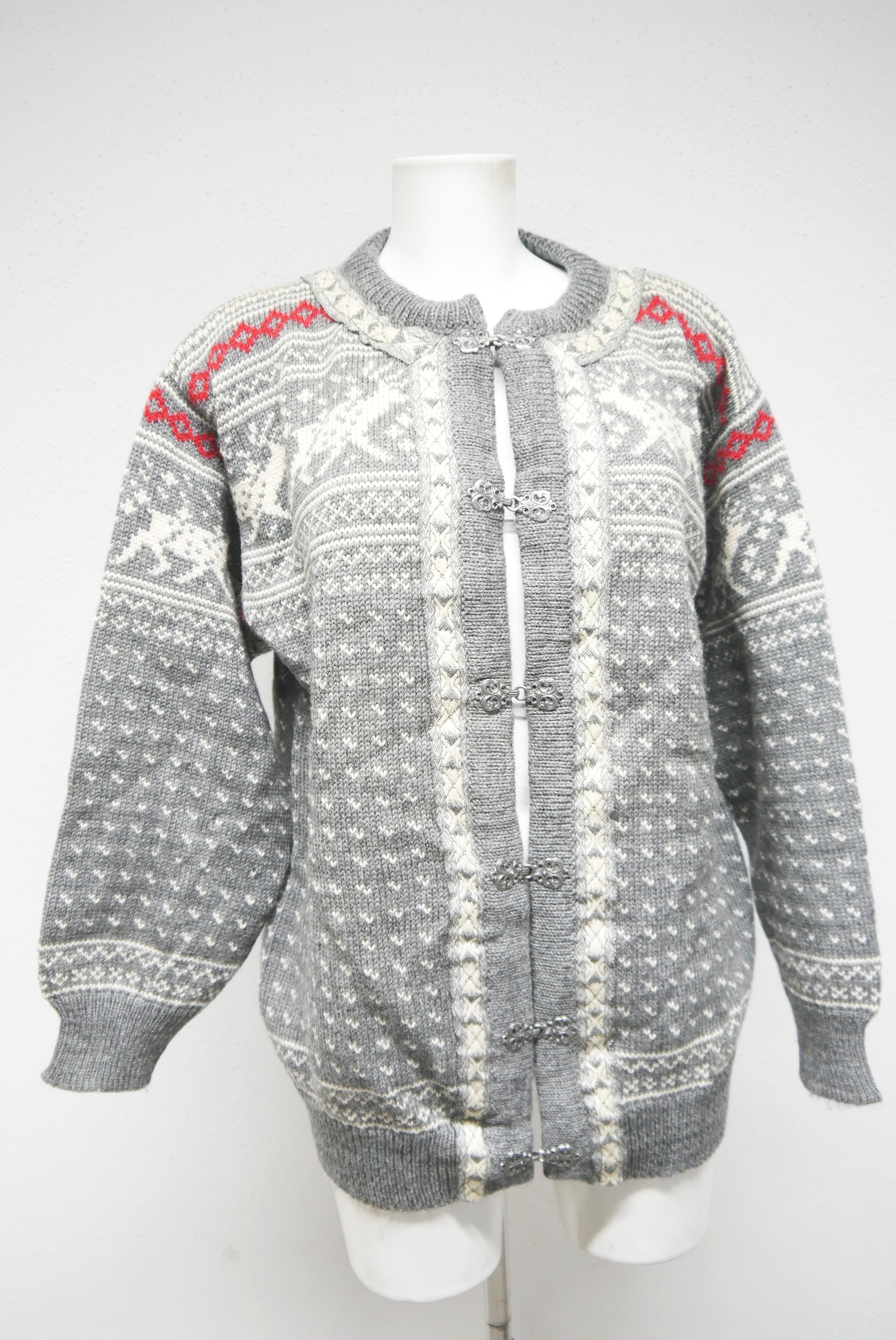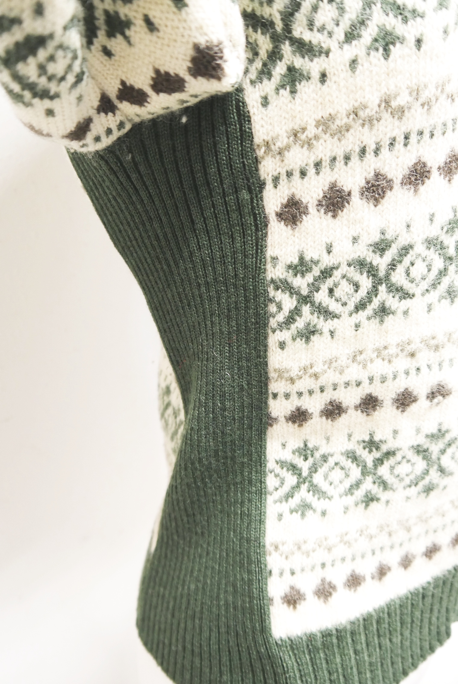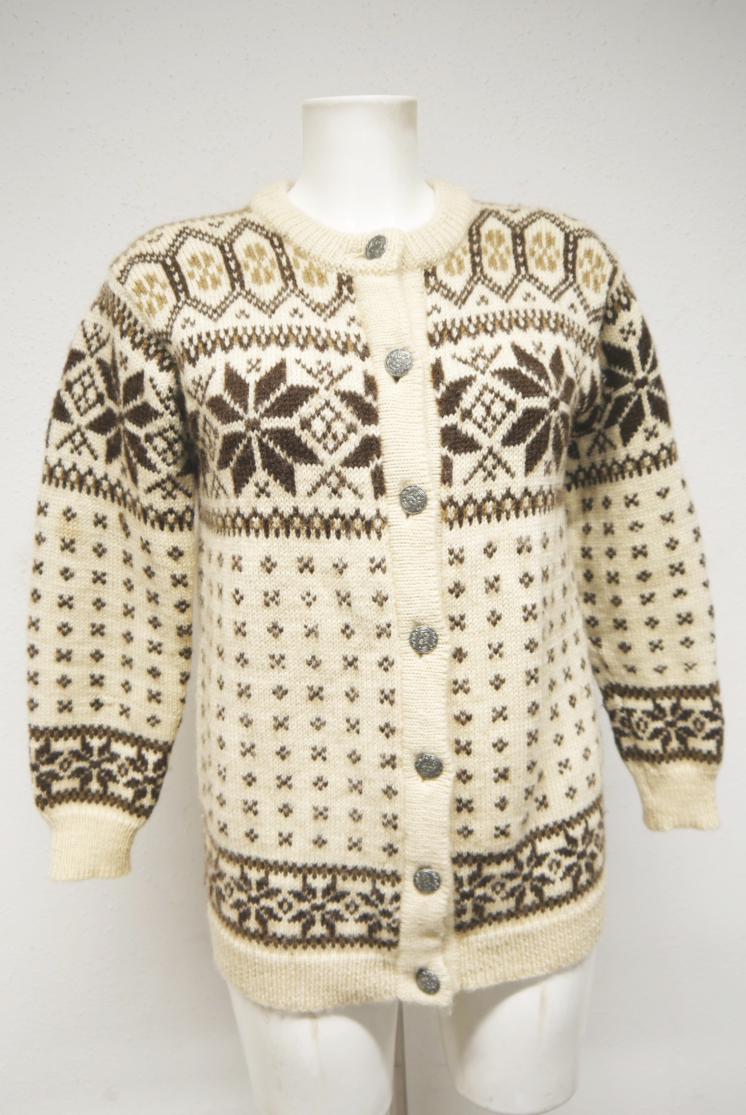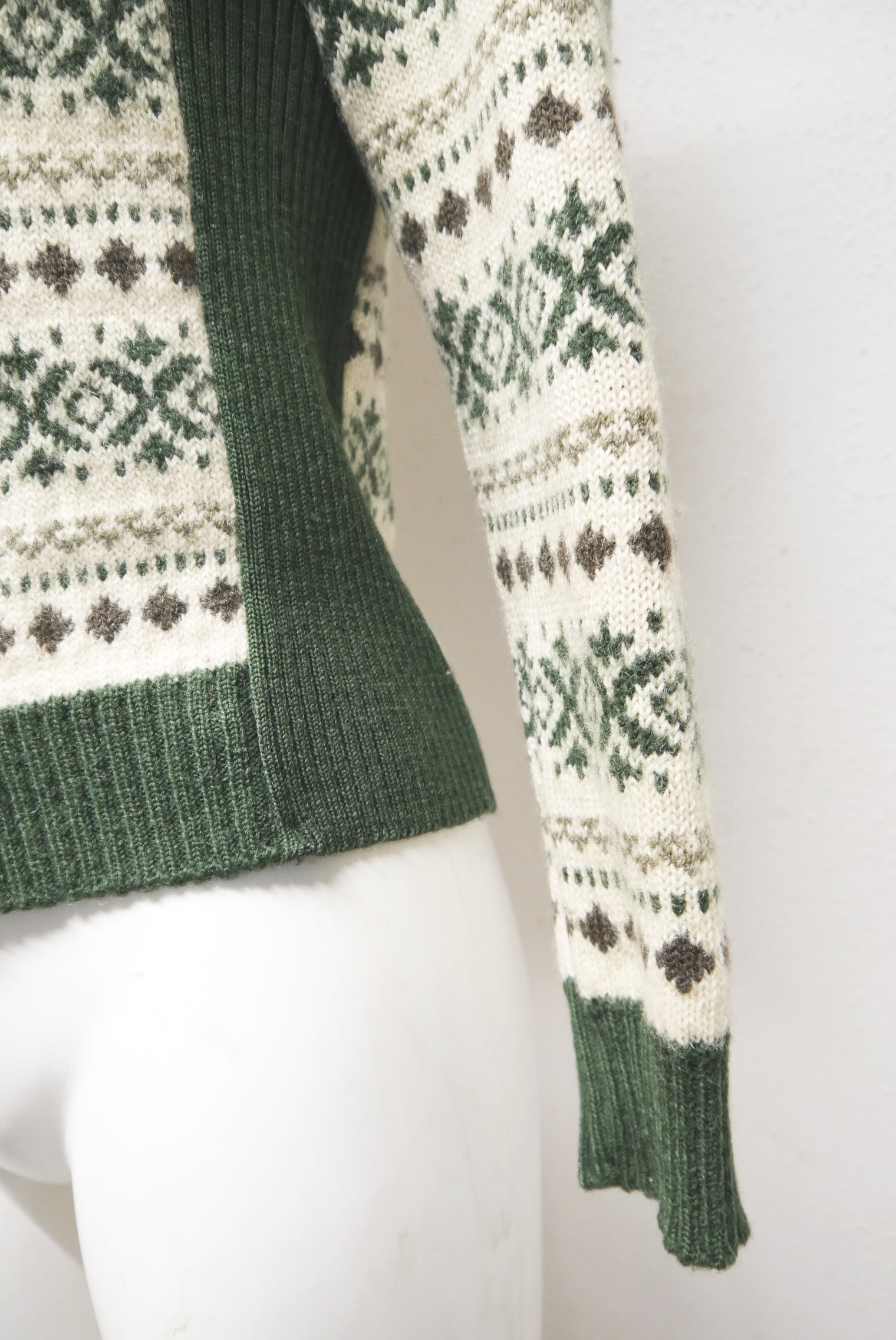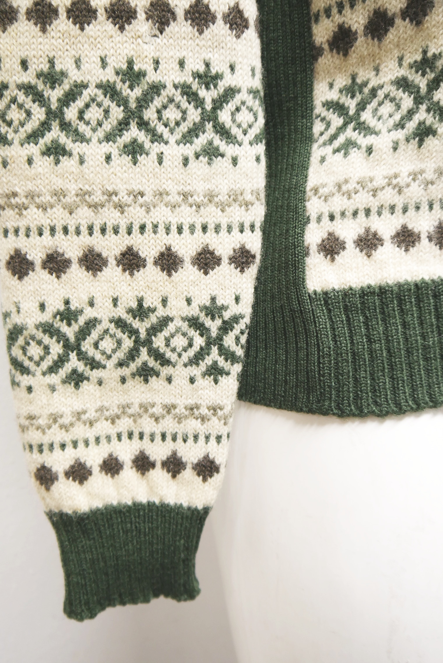 Vintage Damen Norweger Strickjacke neuwertig figurbetonend anliegend warm warm von Geiger aus dicker Schurwolle gestrickt in grün/weiß gemustert modisch zeitlos mit geraden Arm und echten Hirschhornknöpfen.