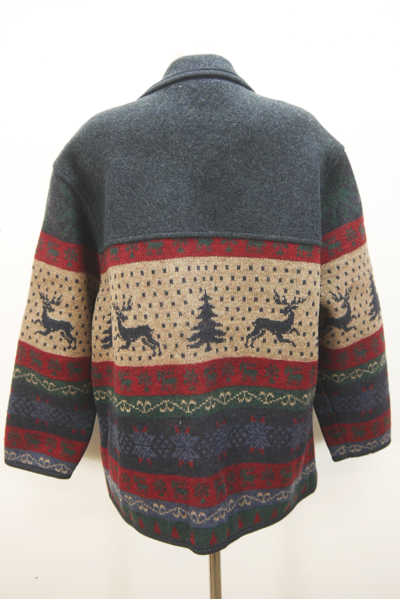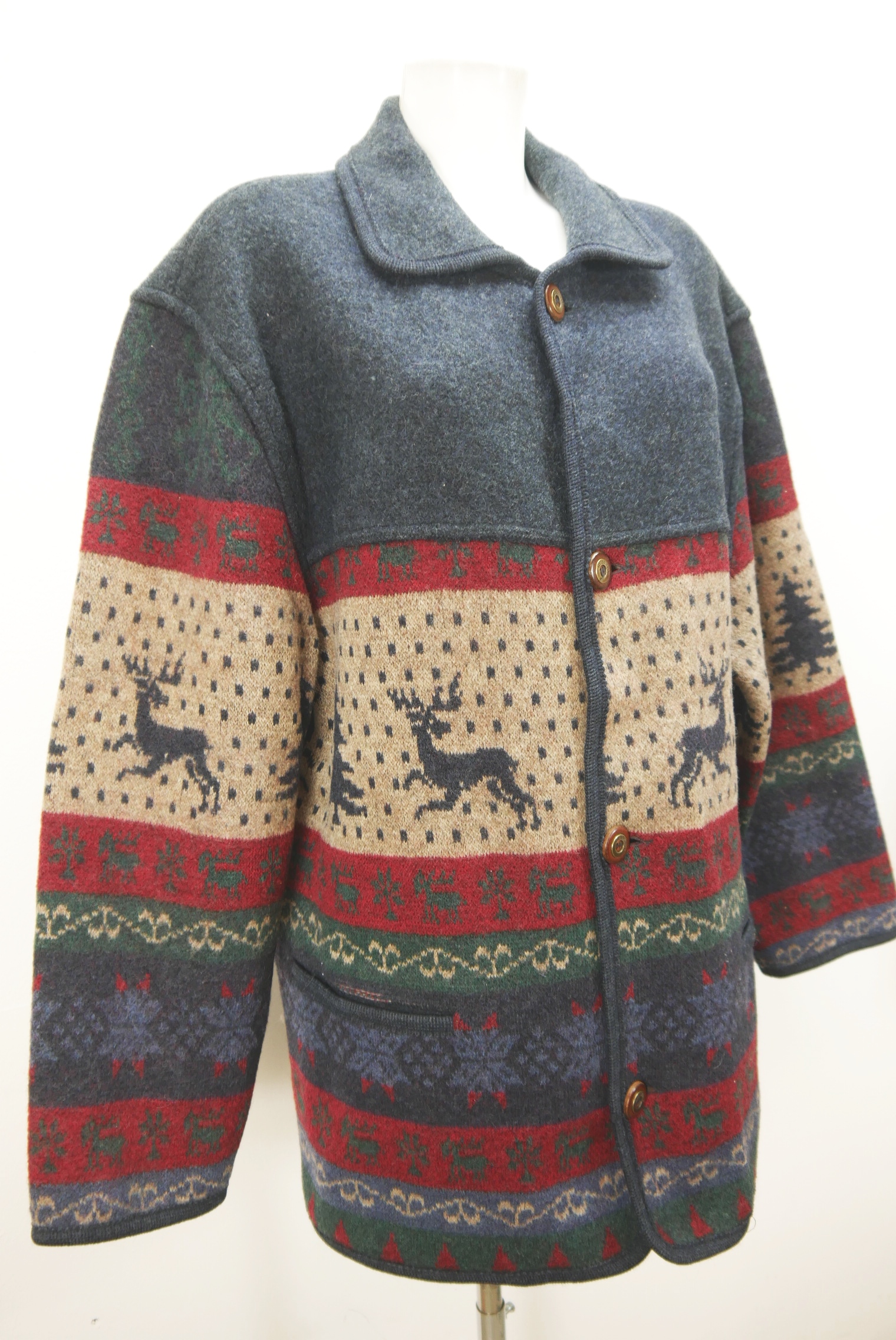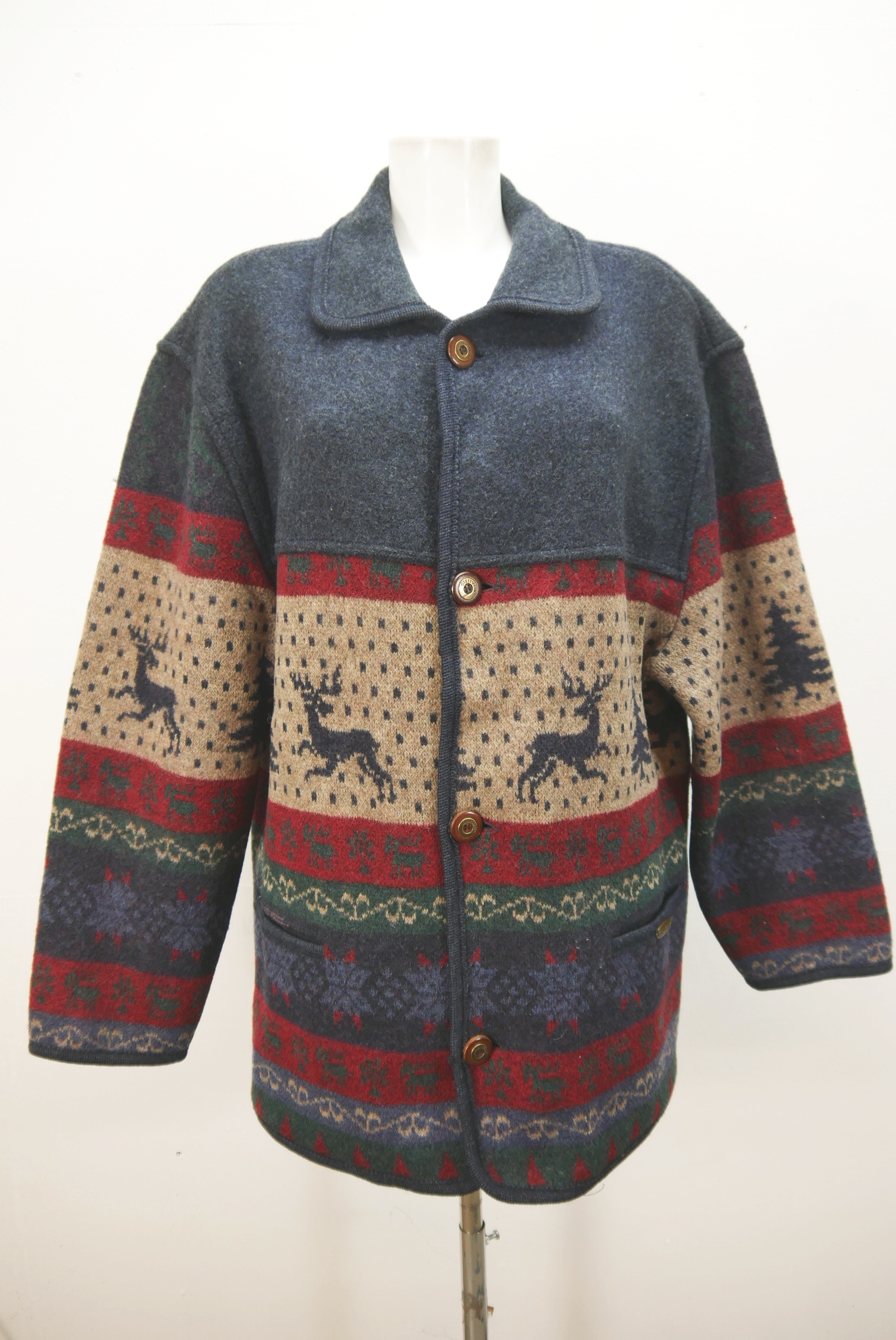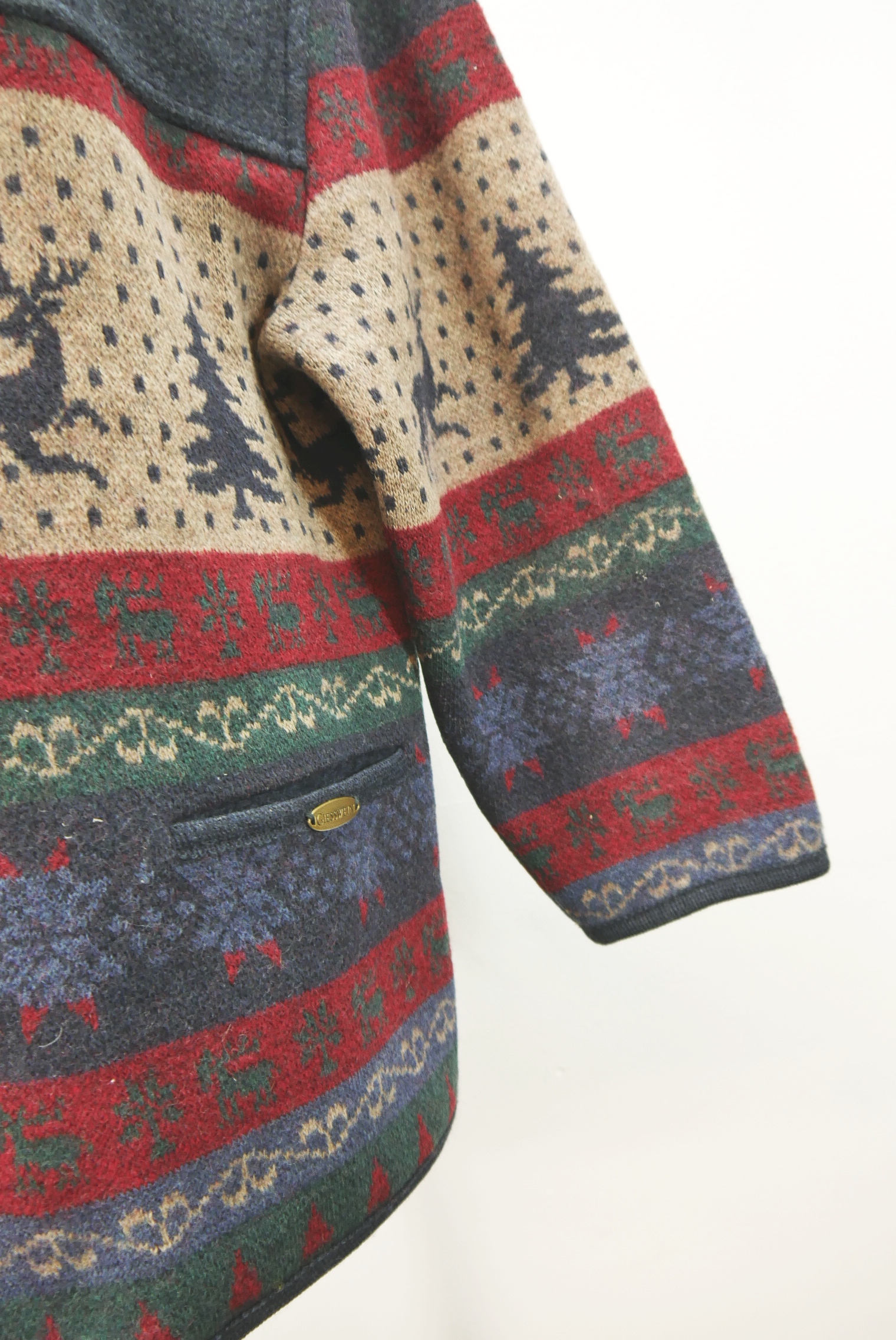 Sehr dicke warme Vintage Strickjacke weit geschnitten neuwertig als Trachtenjacke hochwertig von Giesswein Austria aus Schurwolle gestrickt, braun bunt gemustert innen nicht gefüttert schön mit Winter Motiv als langarm Jacke mit klasse Knöpfen.