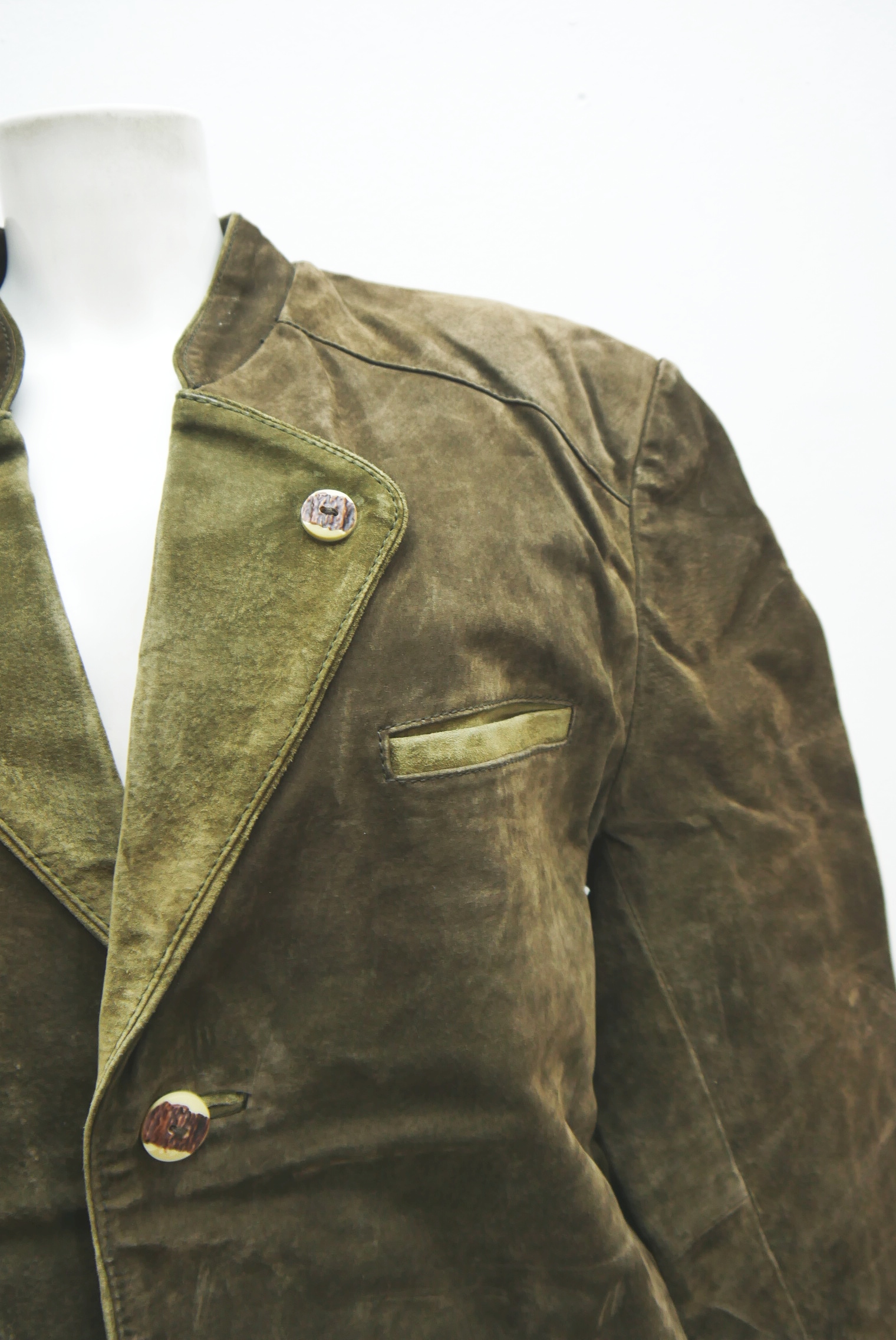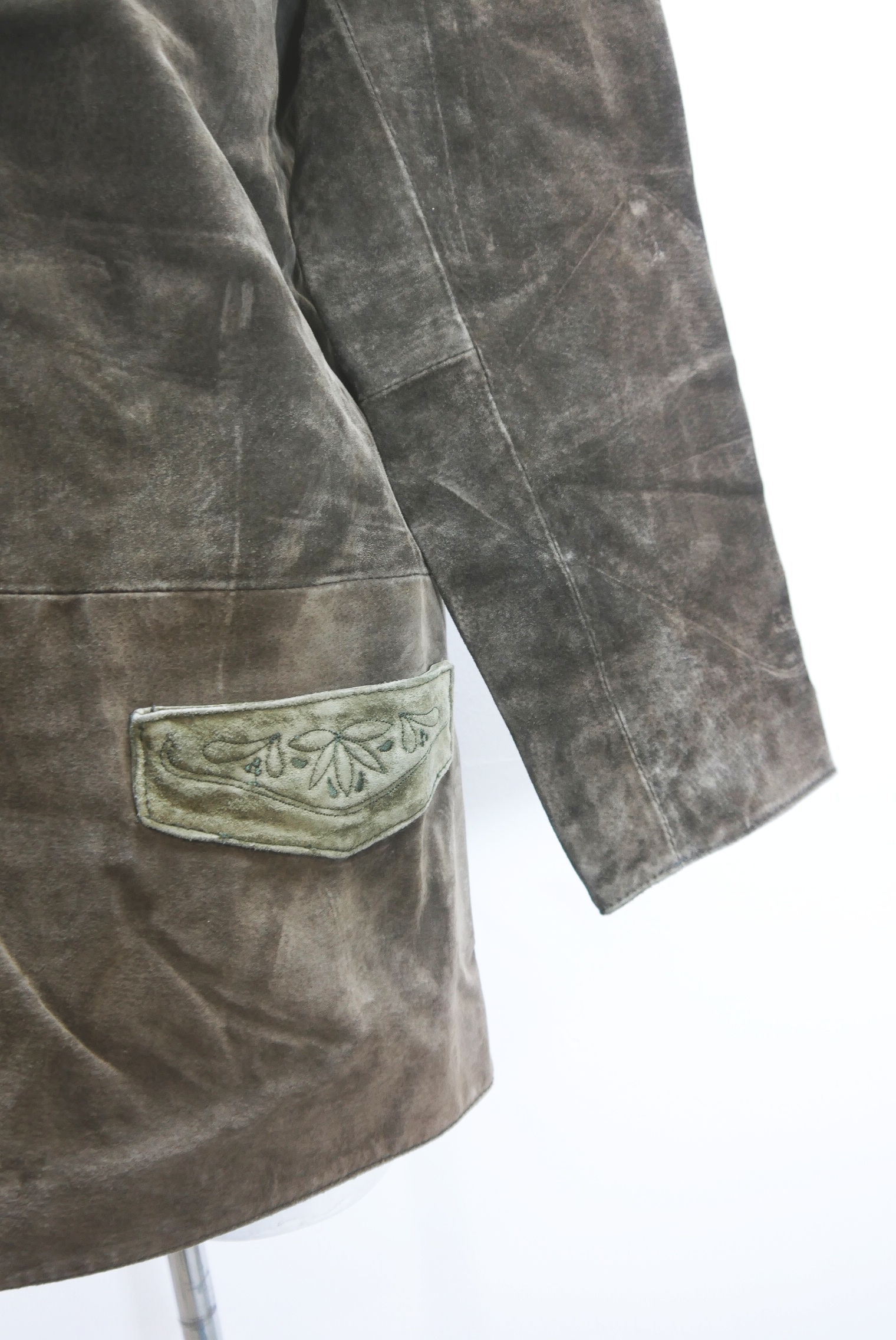 Lässig lange 90er Vintage Lederjacke als Trachtenjacke Janker neuwertig und sehr weit geschnitten von Hunting aus Schweinsvelour Leder gefertigt schön weich in braun und nicht verspeckt, innen gefüttert mit Stickerei auf den Taschen verziert als langarm Jacke mit klasse Knöpfen, – wird meistens offen getragen.
