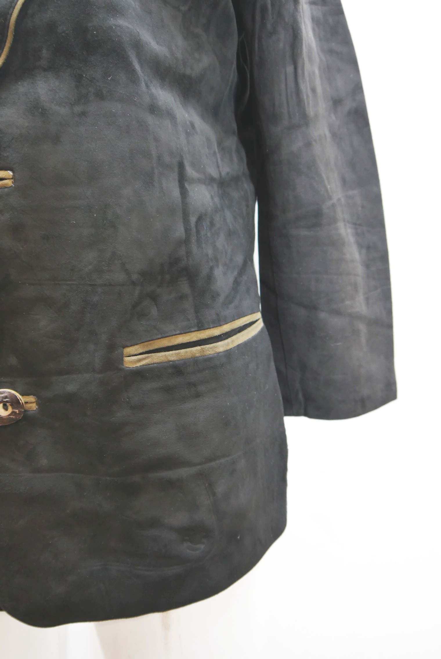 Lässige 90er Vintage Lederjacke anliegend geschnitten als Trachtenjacke von Ingo München aus weichen Ziegenvelour Leder in schwarz nicht speckig und innen gefüttert schön mit Besatz verziert und mit Revers als langarm Jacke mit Kunststoffknöpfen, – wird meistens offen getragen.