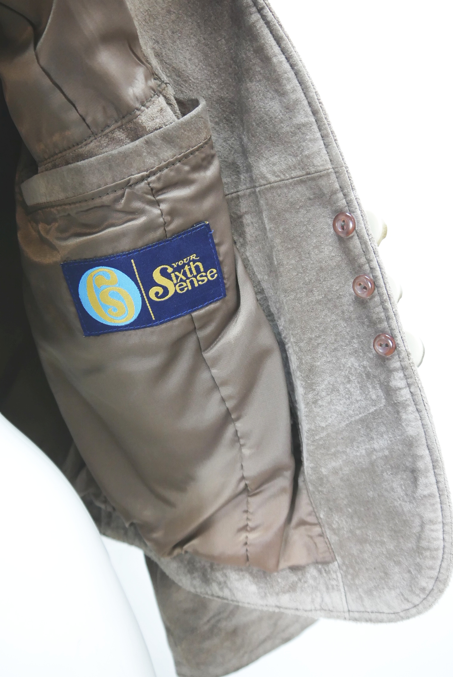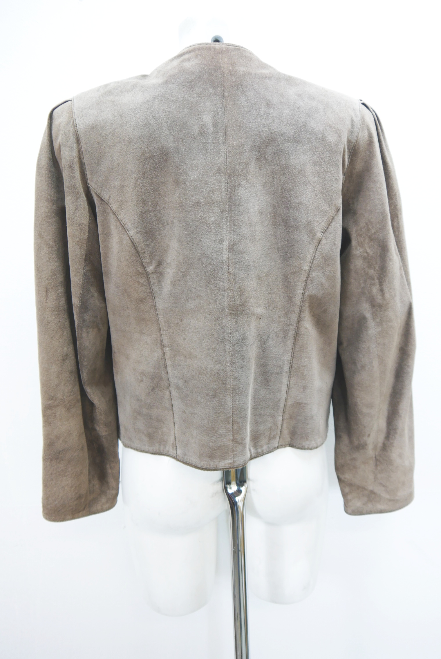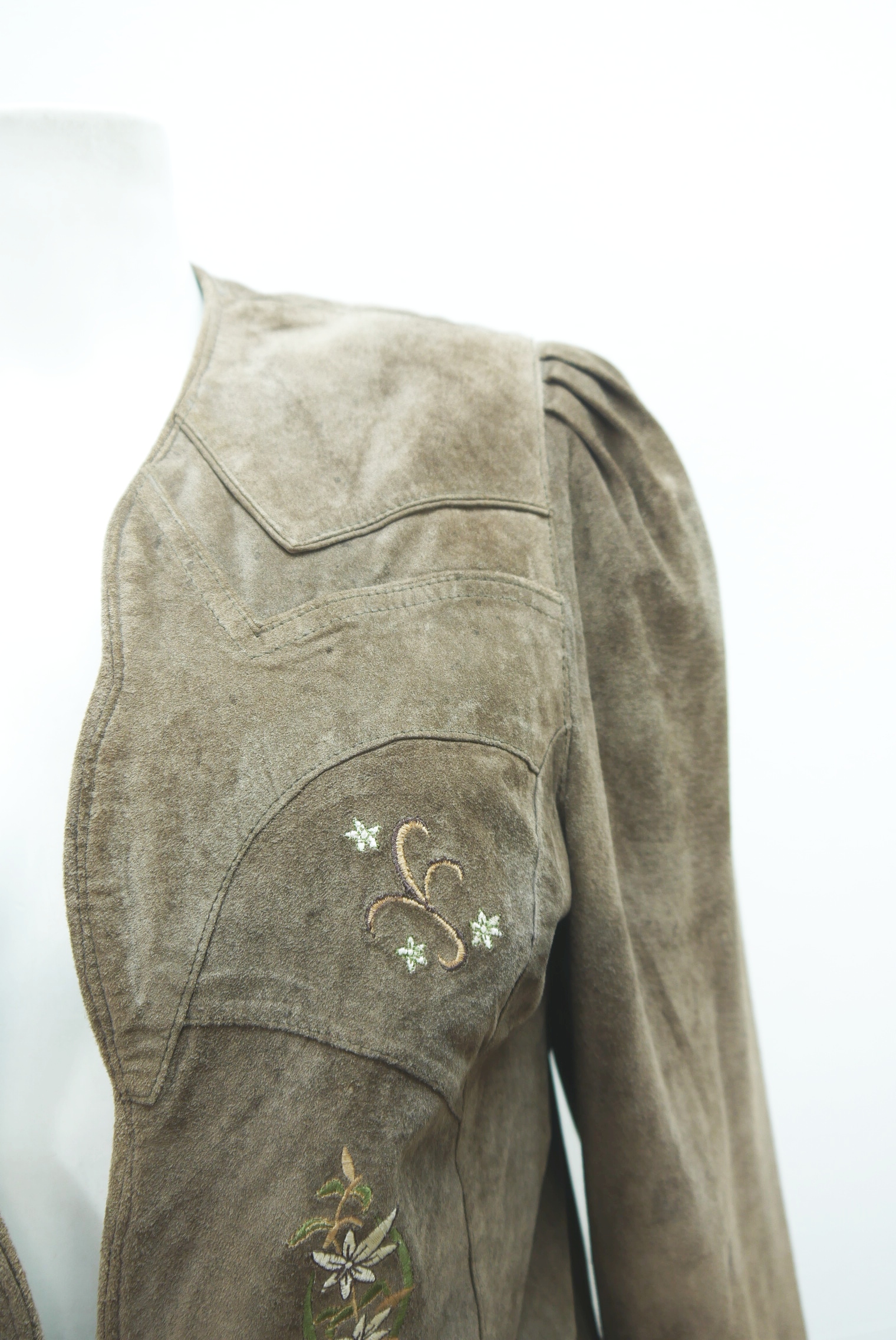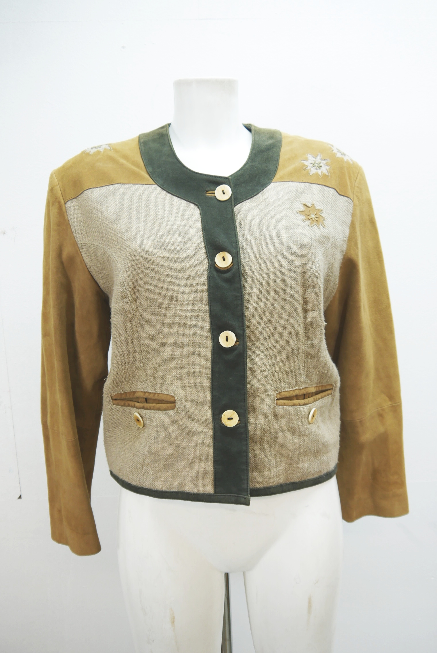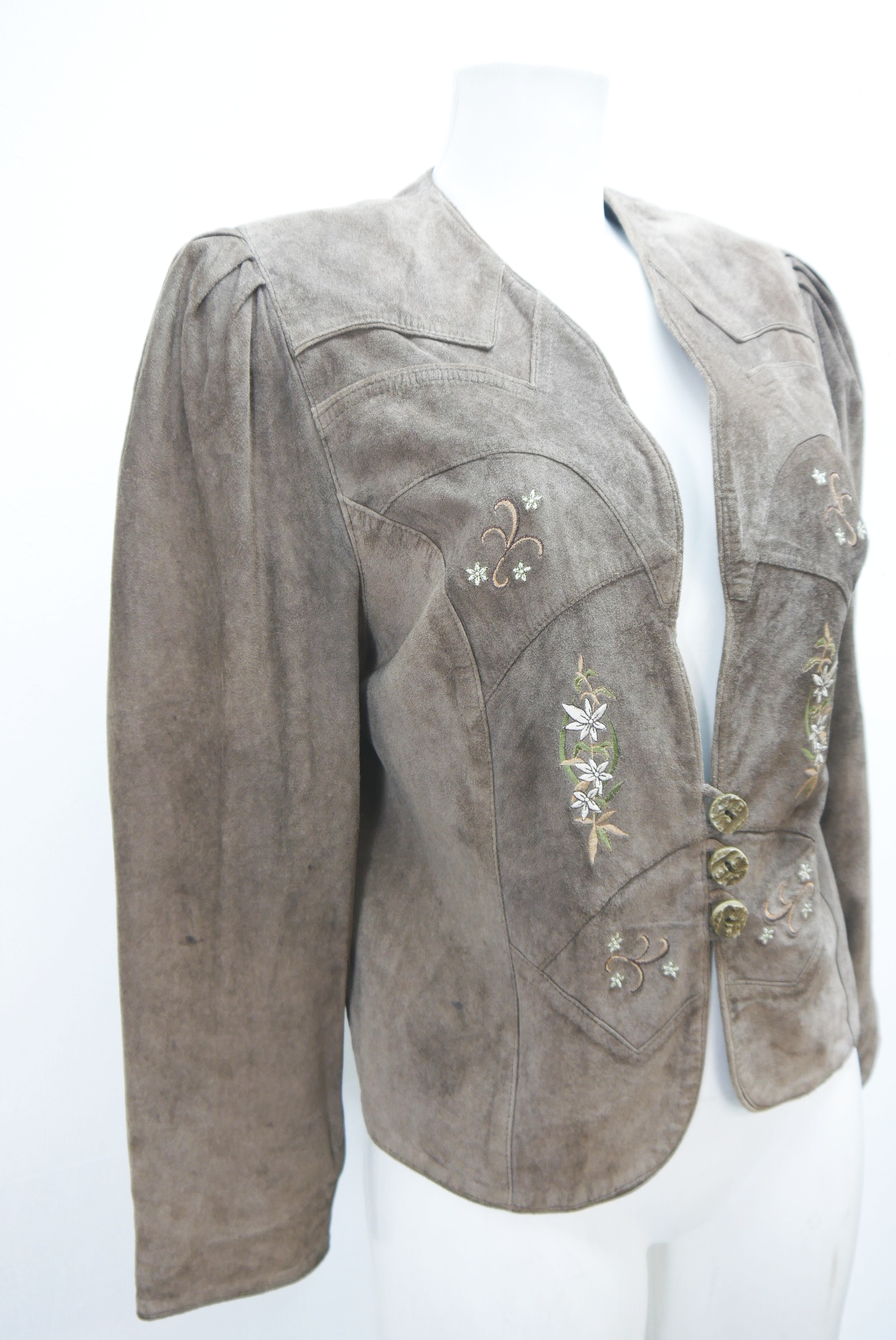 Kurze Vintage Blazer Trachtenjacke in Top Zustand als Lederjacke tailliert geschnitten Trachten Janker von Your Sixth Sense aus Velourleder gefertigt in braun und nicht verspeckt, innen gefüttert mit Stickerei verziert als langarm Puffärmel Jacke mit schönen Knöpfen,- wird meistens offen getragen.
