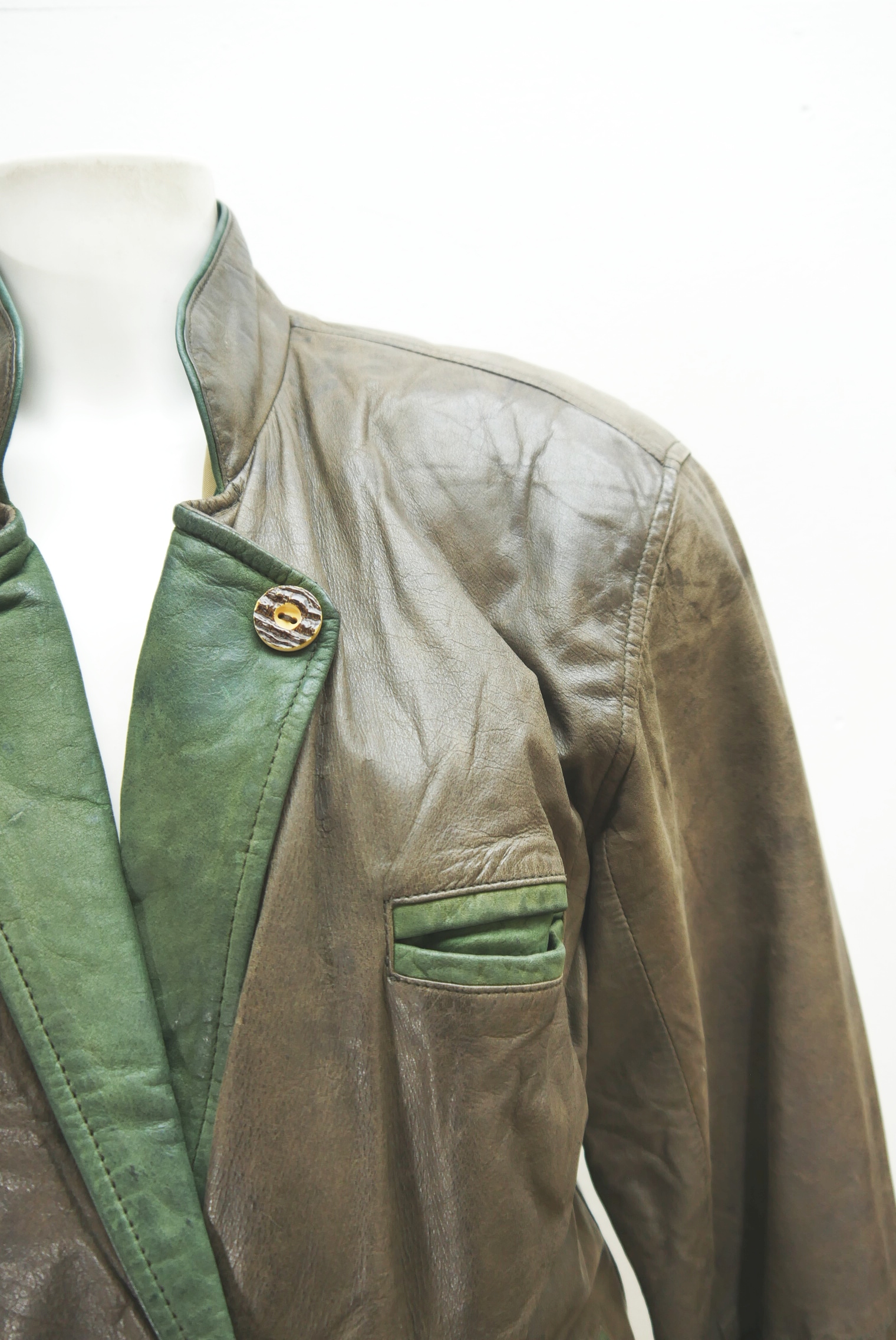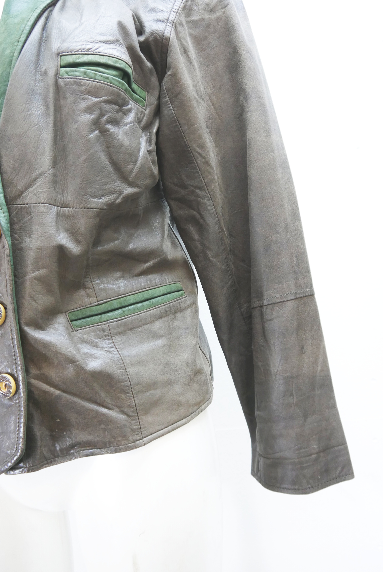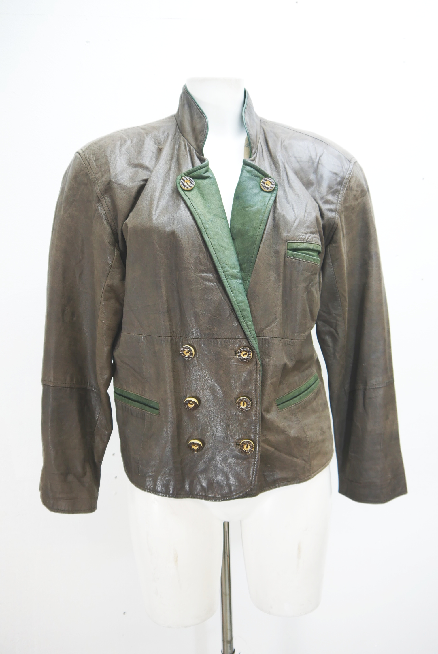 Used-Look eingetragen kurze 90er Vintage Blazer Trachtenjacke als Lederjacke weit geschnitten und leicht verschmutzt Trachten Janker von Franco Callegari aus Glattleder gefertigt in braun und leicht verspeckt, innen gefüttert mit grün abgesetzt als langarm Jacke mit schönen Knöpfen,- wird meistens offen getragen.