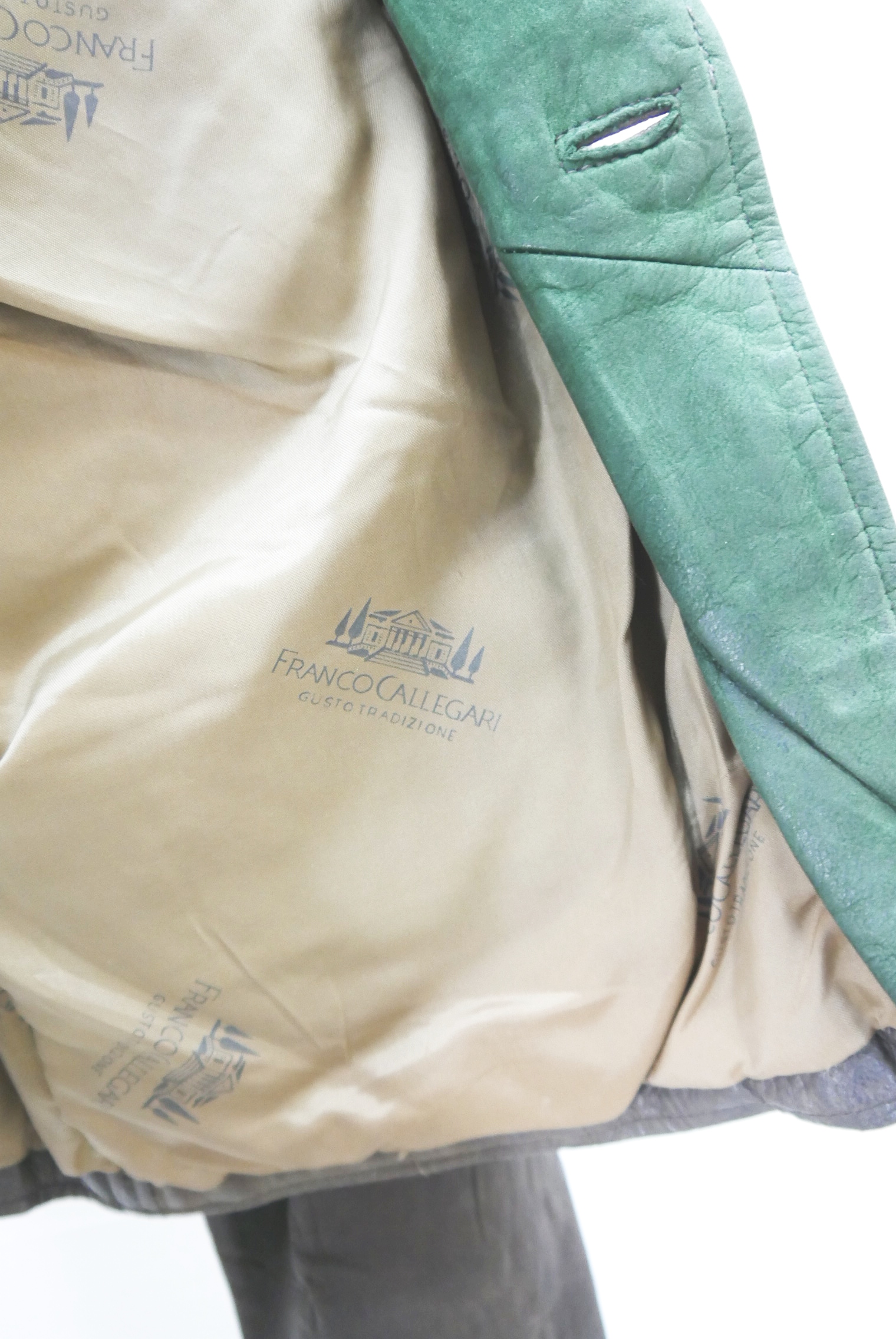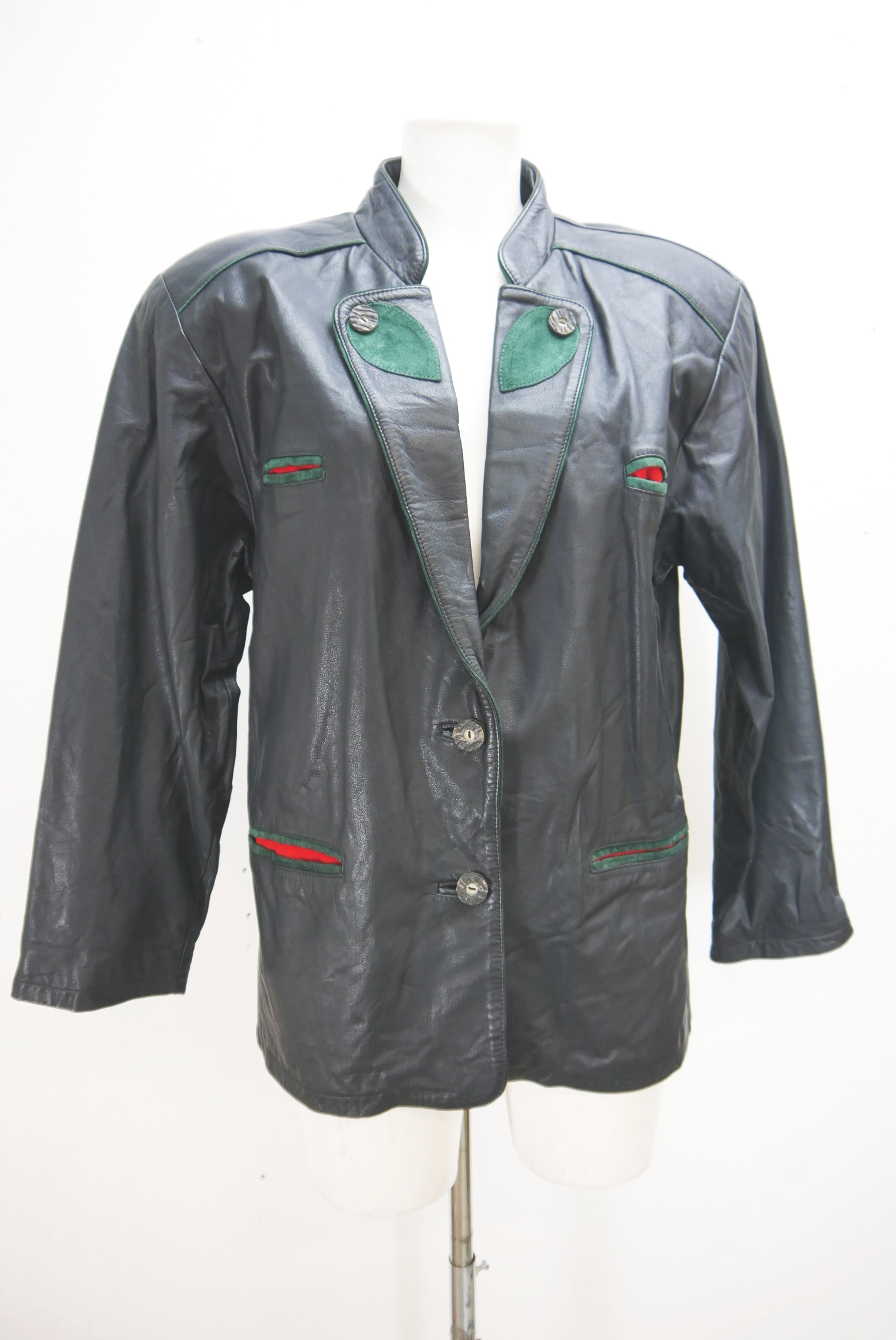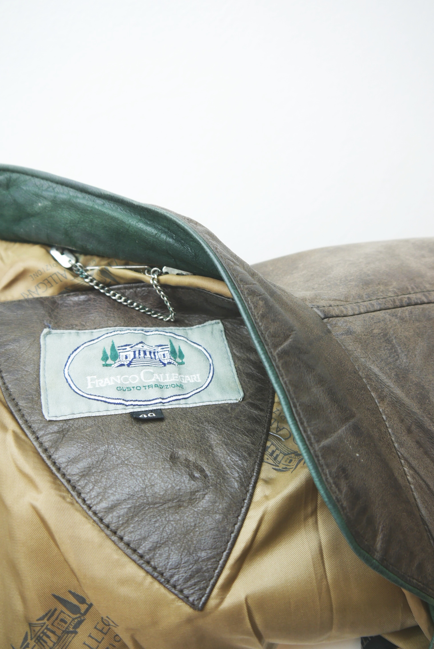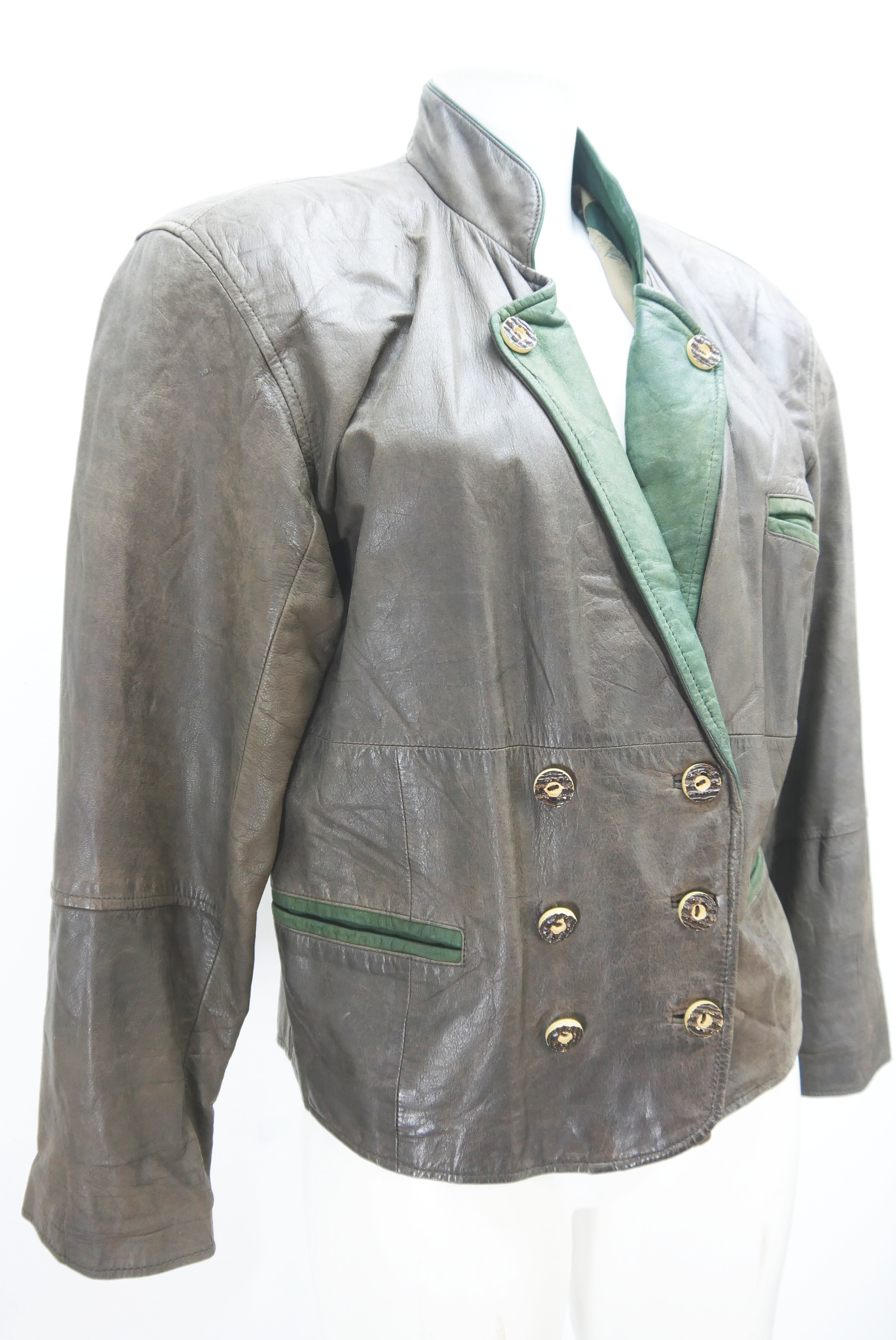 Used-Look eingetragen kurze 90er Vintage Blazer Trachtenjacke als Lederjacke weit geschnitten und leicht verschmutzt Trachten Janker von Franco Callegari aus Glattleder gefertigt in braun und leicht verspeckt, innen gefüttert mit grün abgesetzt als langarm Jacke mit schönen Knöpfen,- wird meistens offen getragen.