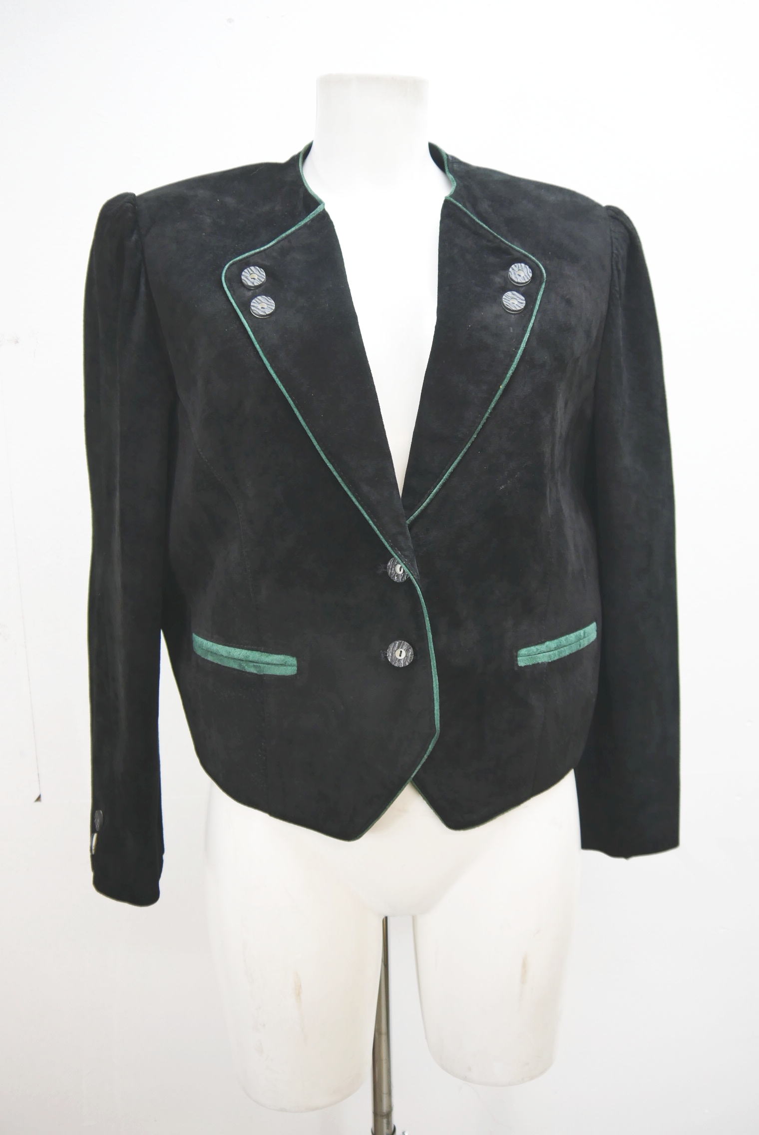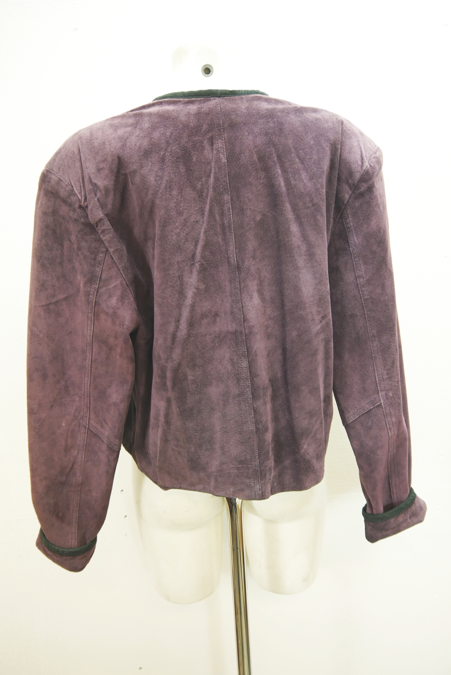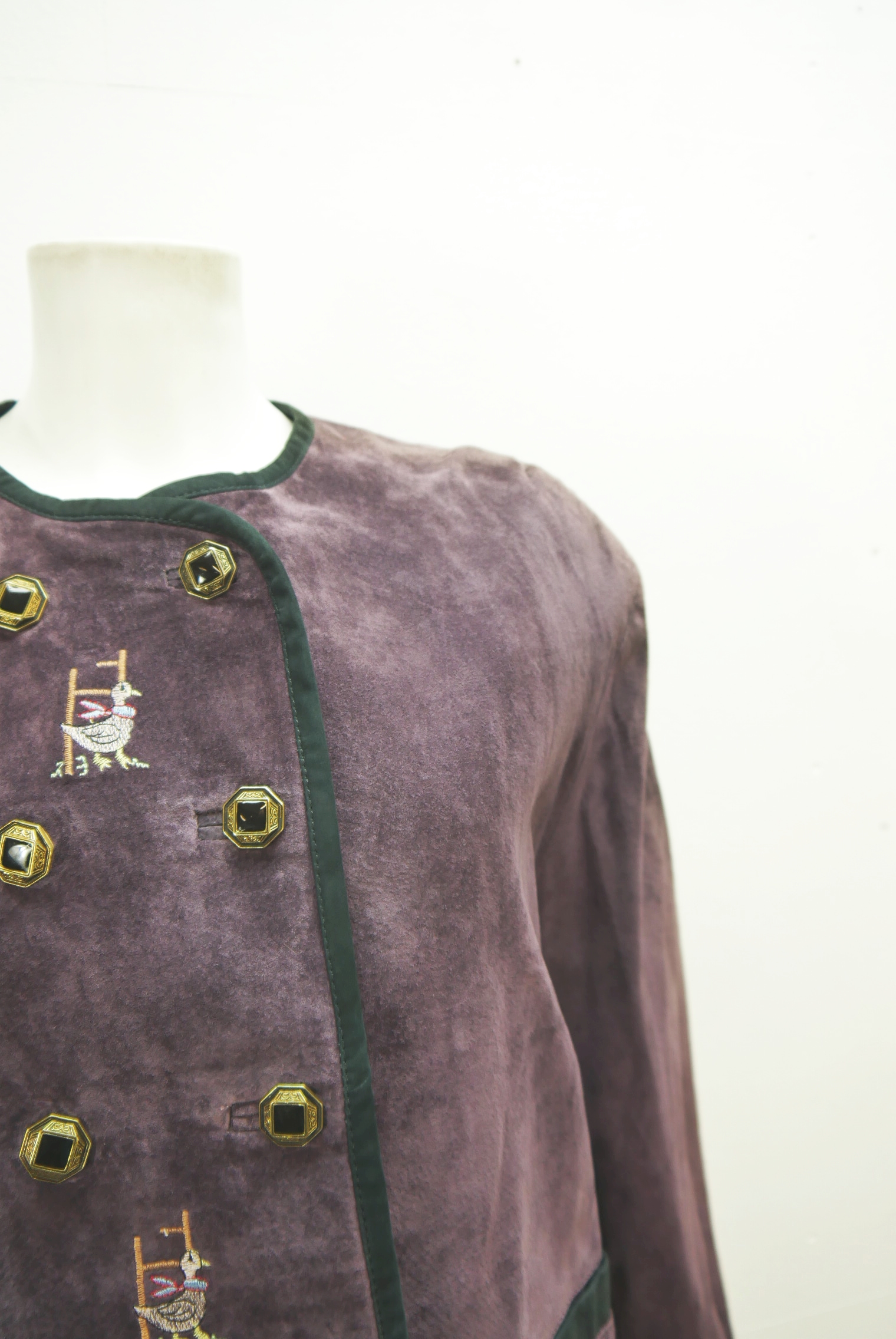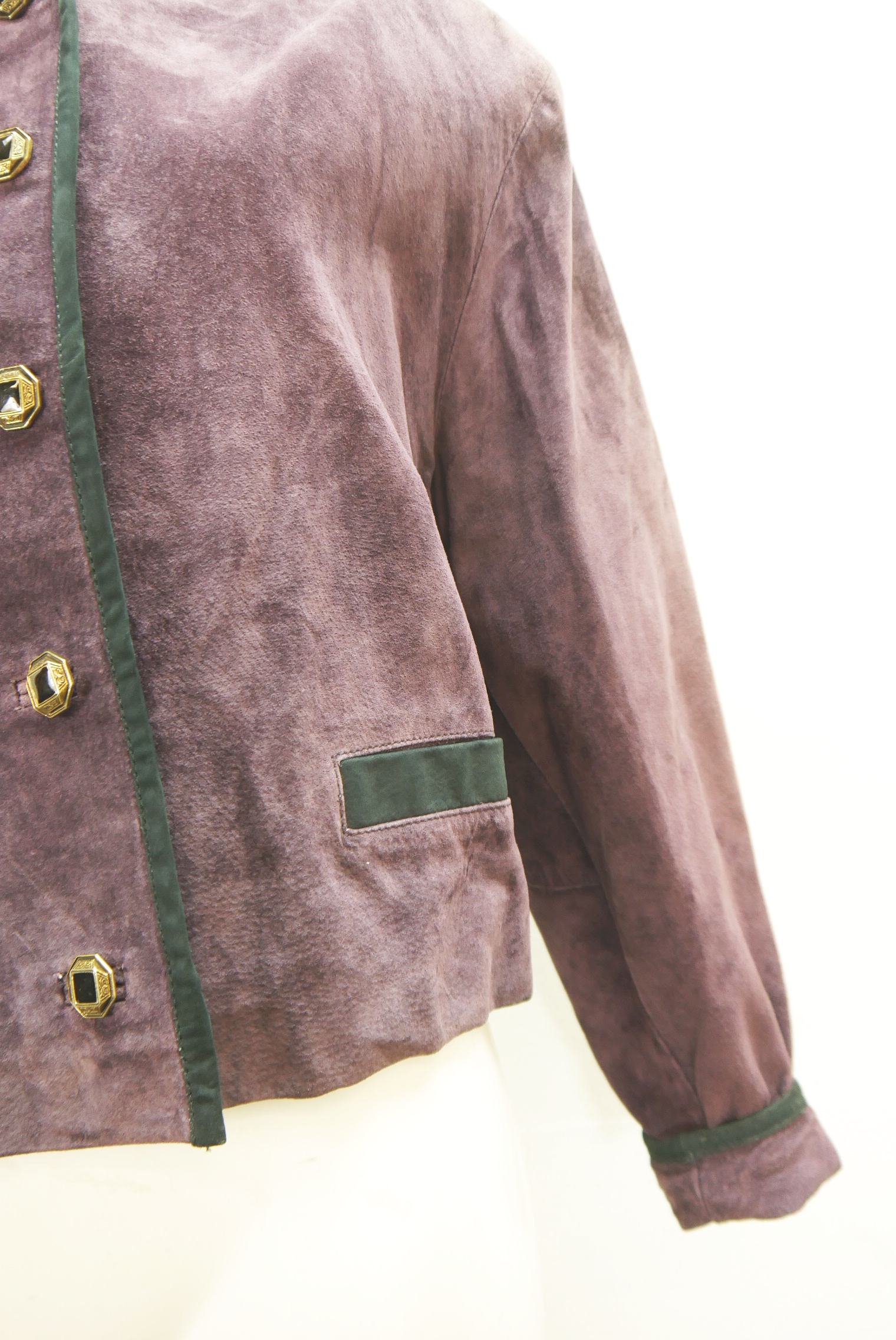 Kurze Vintage Blazer 2 Reiher Trachtenjacke neuwertig als Lederjacke tailliert geschnitten Trachten Janker von Miss Joy aus Wildleder gefertigt in lila und nicht verspeckt, innen gefüttert mit Stickerei verziert als langarm Jacke mit schönen Knöpfen,- wird meistens offen getragen.