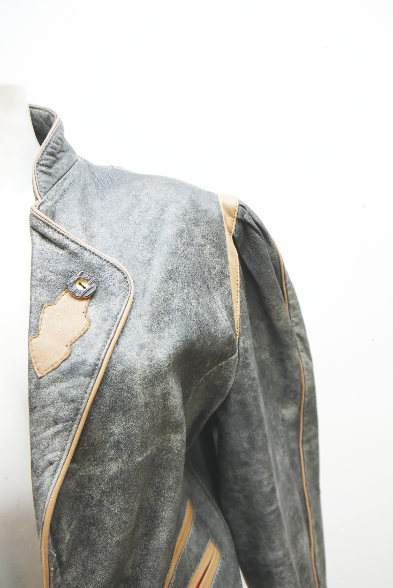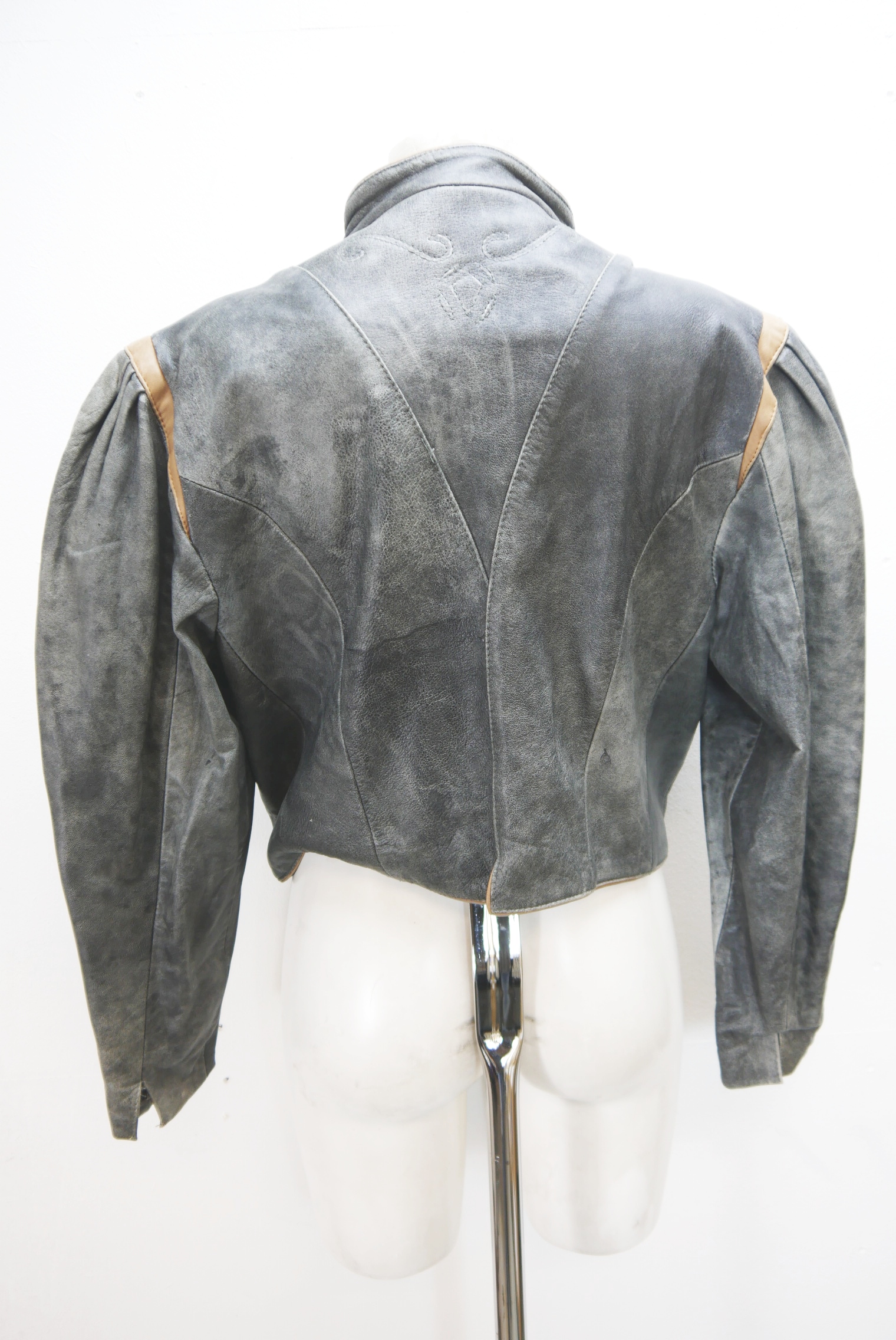 Kurze 90er Vintage Blazer Trachtenjacke in Top Zustand als Lederjacke tailliert geschnitten Trachten Janker markenlos aus Glattleder gefertigt in grau und nicht verspeckt, innen gefüttert mit gerafften Ärmel an den Schultern und mit Besatz verziert als langarm Jacke mit schönen Knöpfen,- wird meistens offen getragen.