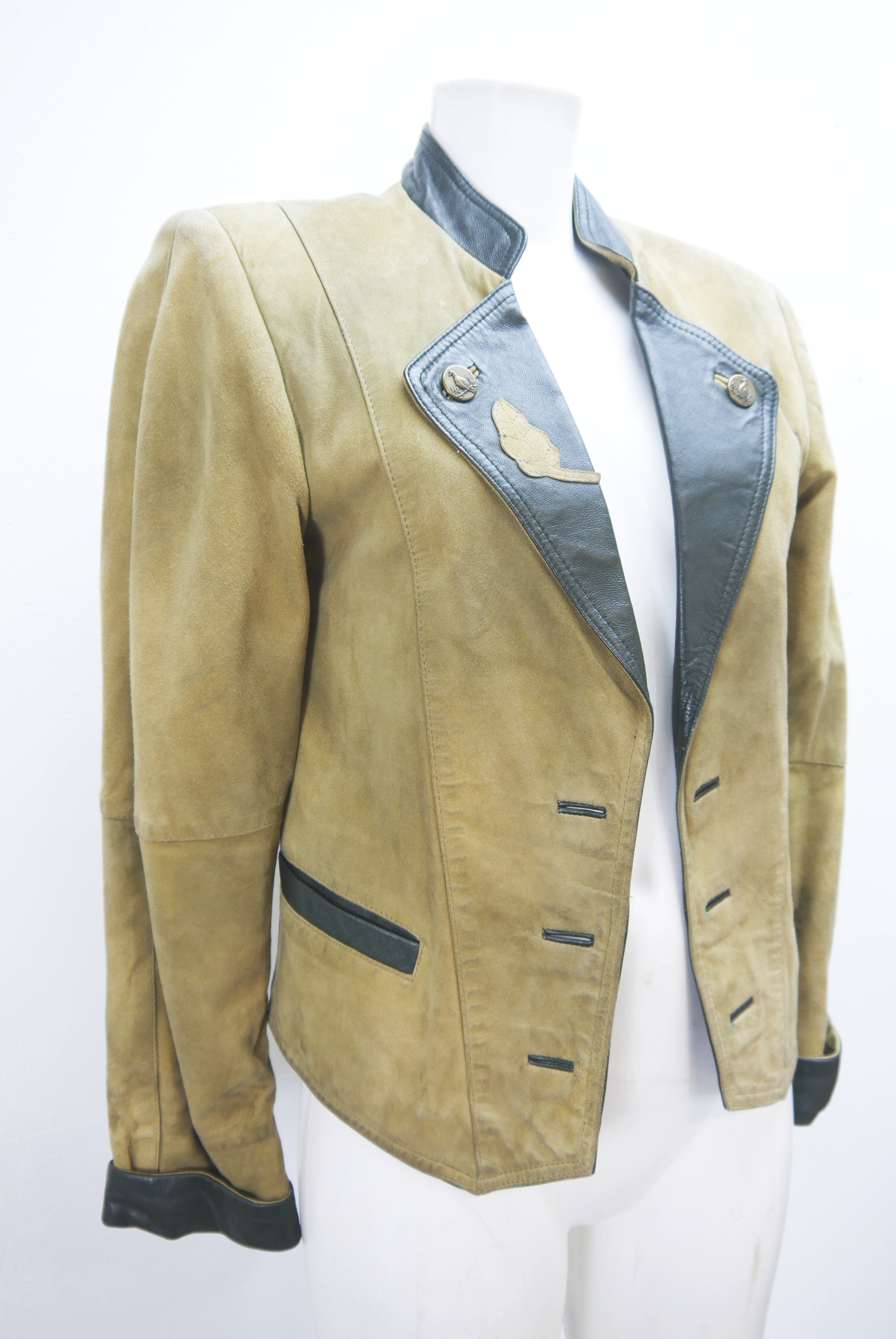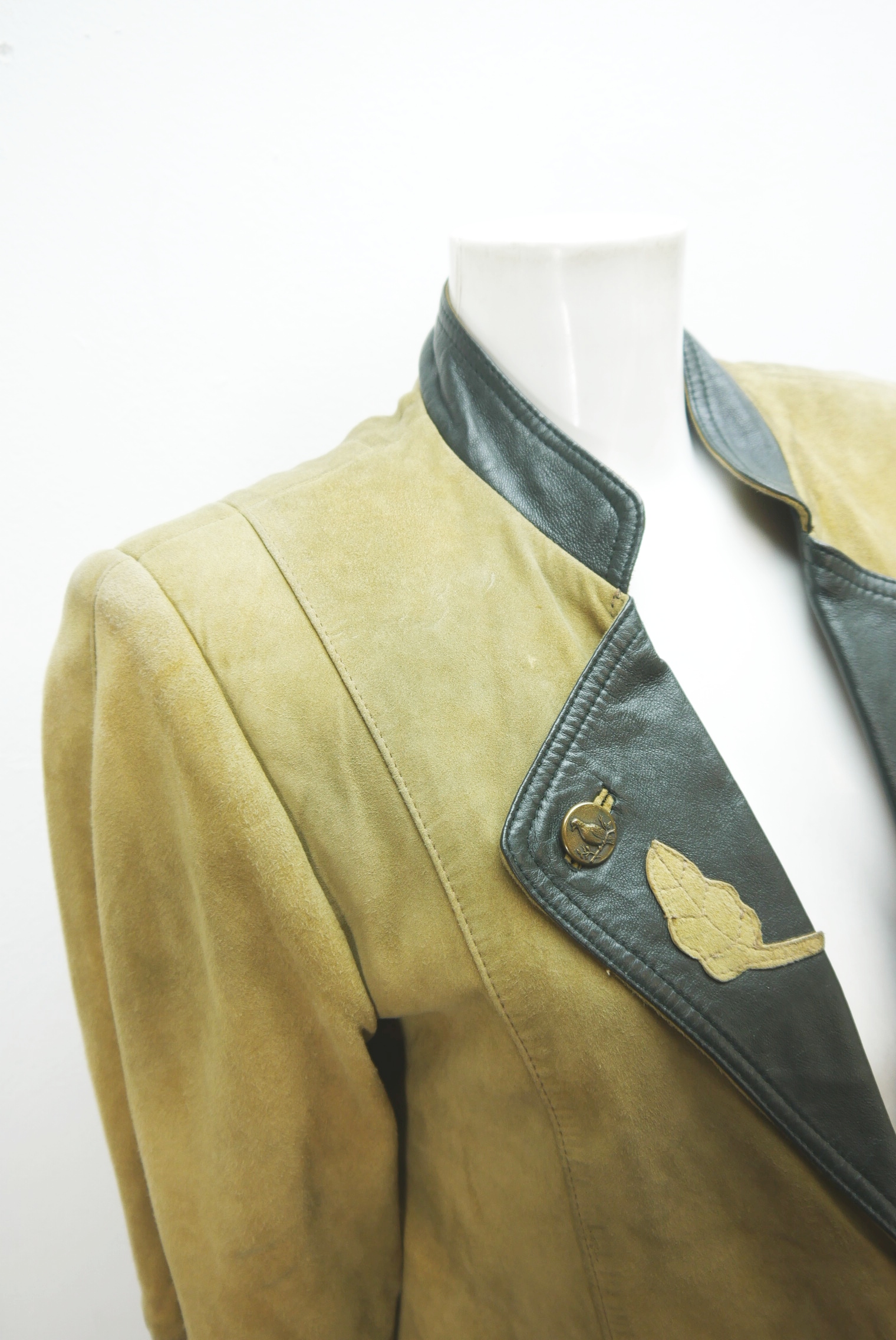 Kurze 80er Vintage Blazer Trachtenjacke gut eingetragen als Lederjacke tailliert geschnitten Trachten Janker von WLB aus Ziegenvelour gefertigt in braun und leicht verspeckt, innen gefüttert mit Besatz verziert als langarm Jacke ohne Knöpfe mit Kettenverschluß doch die Kette fehlt,- wird meistens offen getragen.