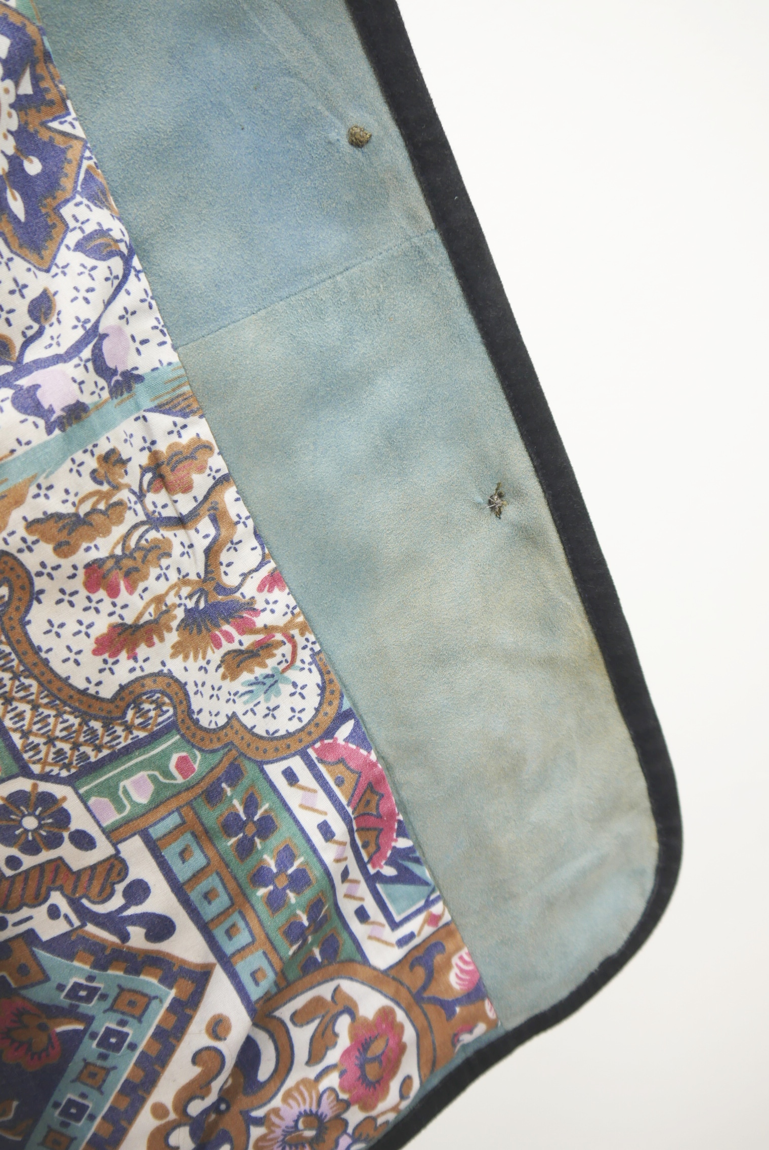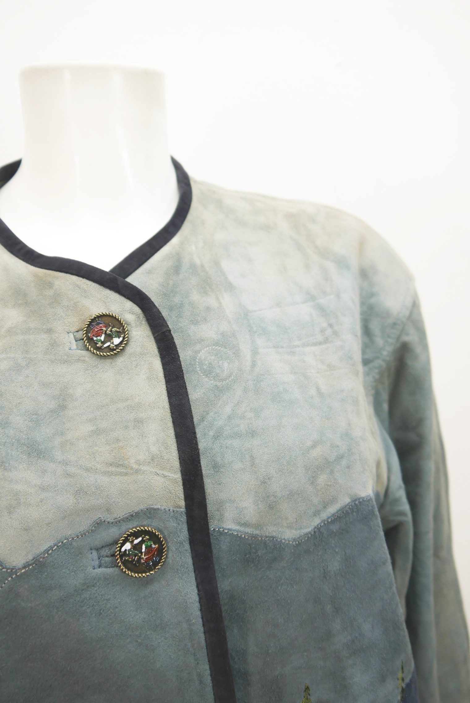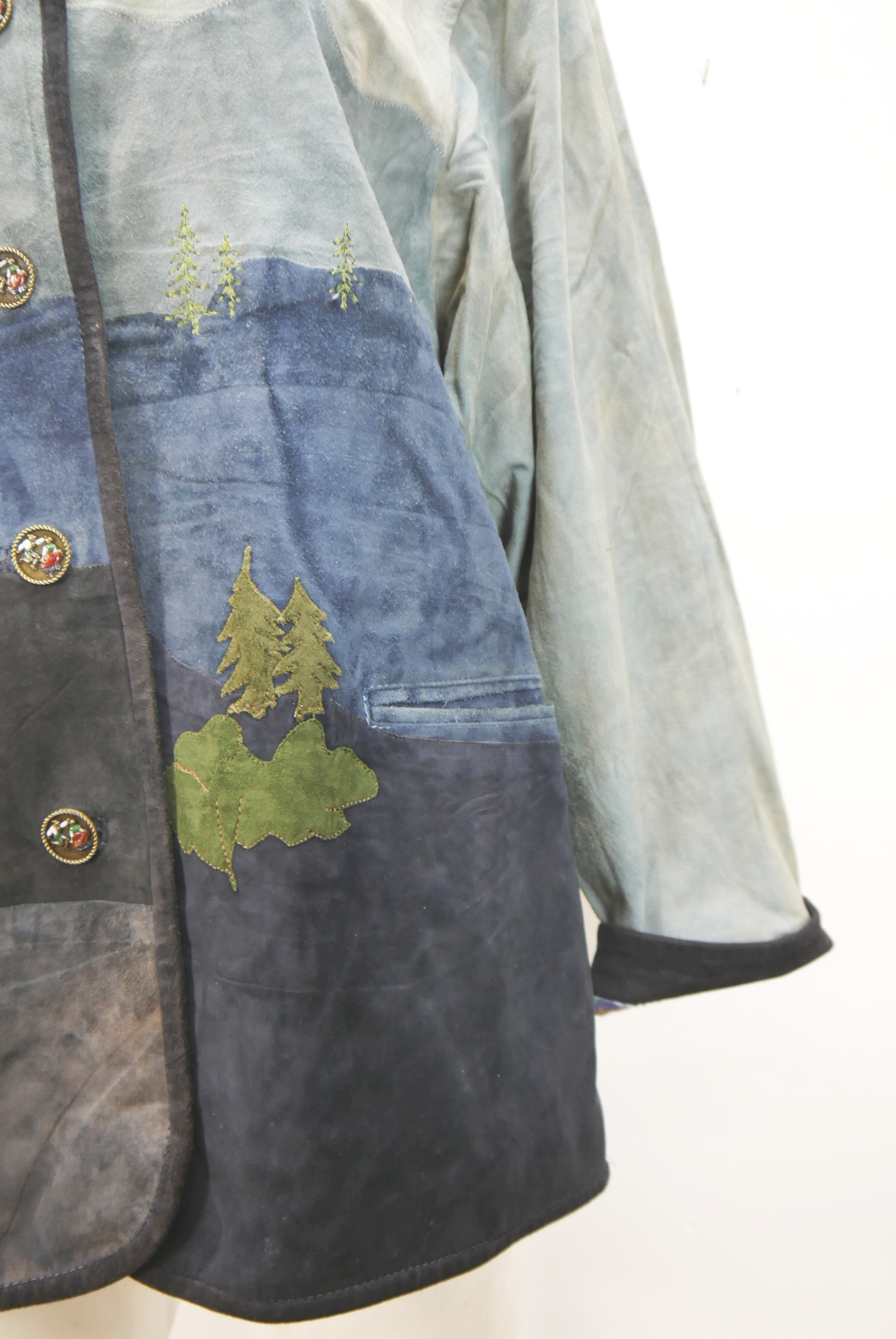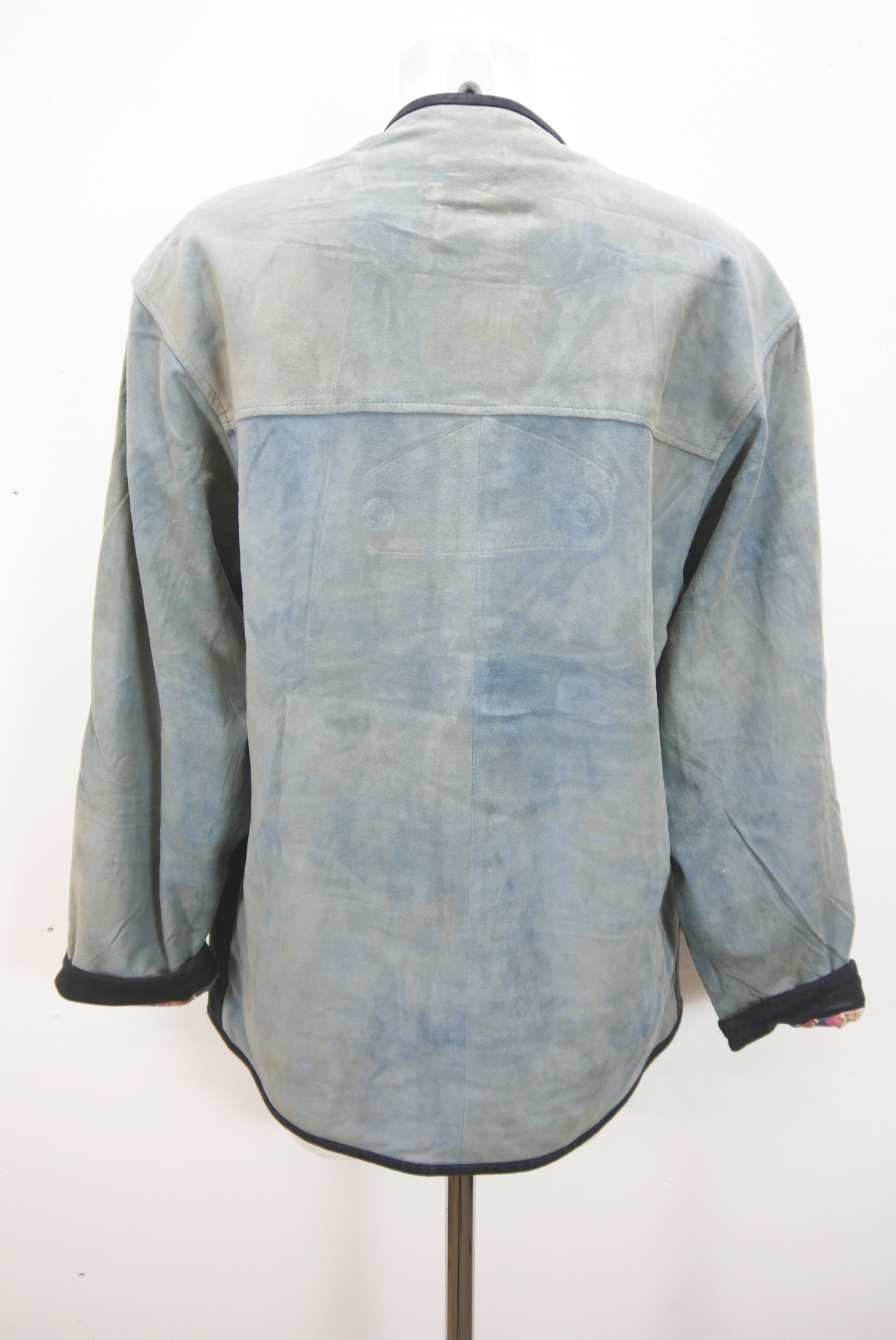 Lange Vintage Blazer Trachtenjacke in Top Zustand als Lederjacke sehr weit geschnitten Trachten Janker von Meindl aus Ziegenvelour Leder gefertigt in blau und nicht verspeckt, innen gefüttert mit Stickerei verziert als langarm Jacke mit schönen Knöpfen,- wird meistens offen getragen.