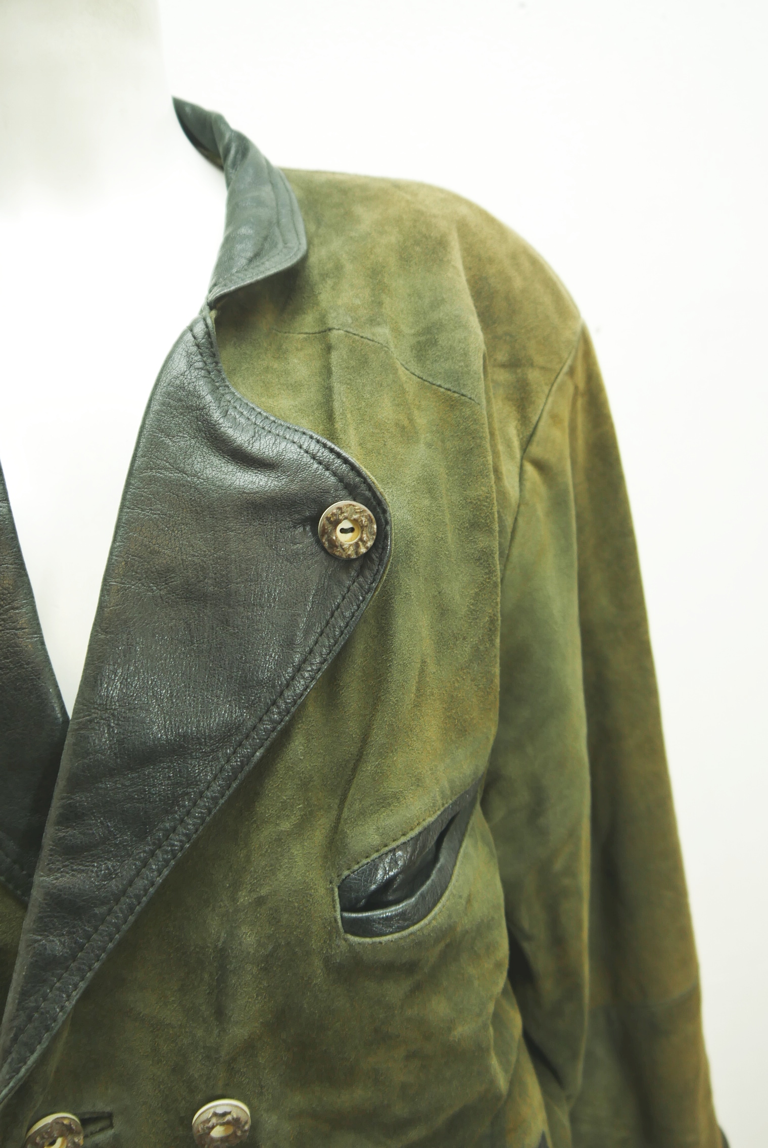 Lange lässige 90er Vintage 2 Reiher Lederjacke in Antikleder Look als Trachtenjacke markenlos aus Ziegenvelour Leder in grün, leicht speckig und innen gefüttert schön schlicht ohne Stickerei mit Revers als langarm Jacke mit Kunststoffknöpfen, – wird meistens offen getragen.