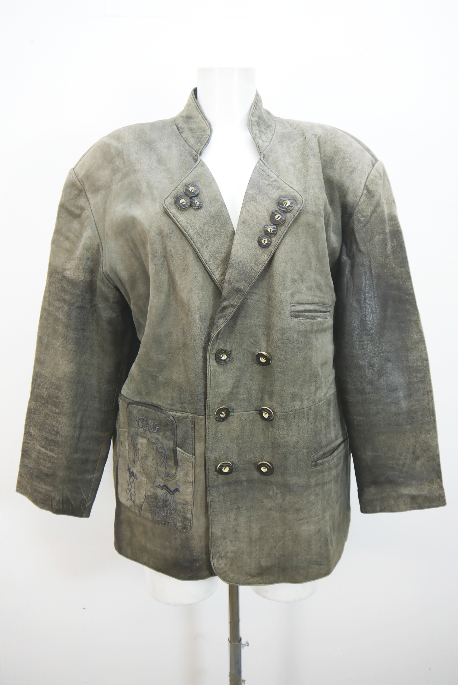 Lässig lange Vintage Lederjacke als Trachtenjacke Janker in Top Zustand von Montes aus Ziegenvelour Leder gefertigt schön weich in rot und nicht verspeckt und innen gefüttert schön mit Besatz auf der rechten Tasche verziert als langarm Jacke mit klasse Knöpfen, – wird meistens offen getragen.