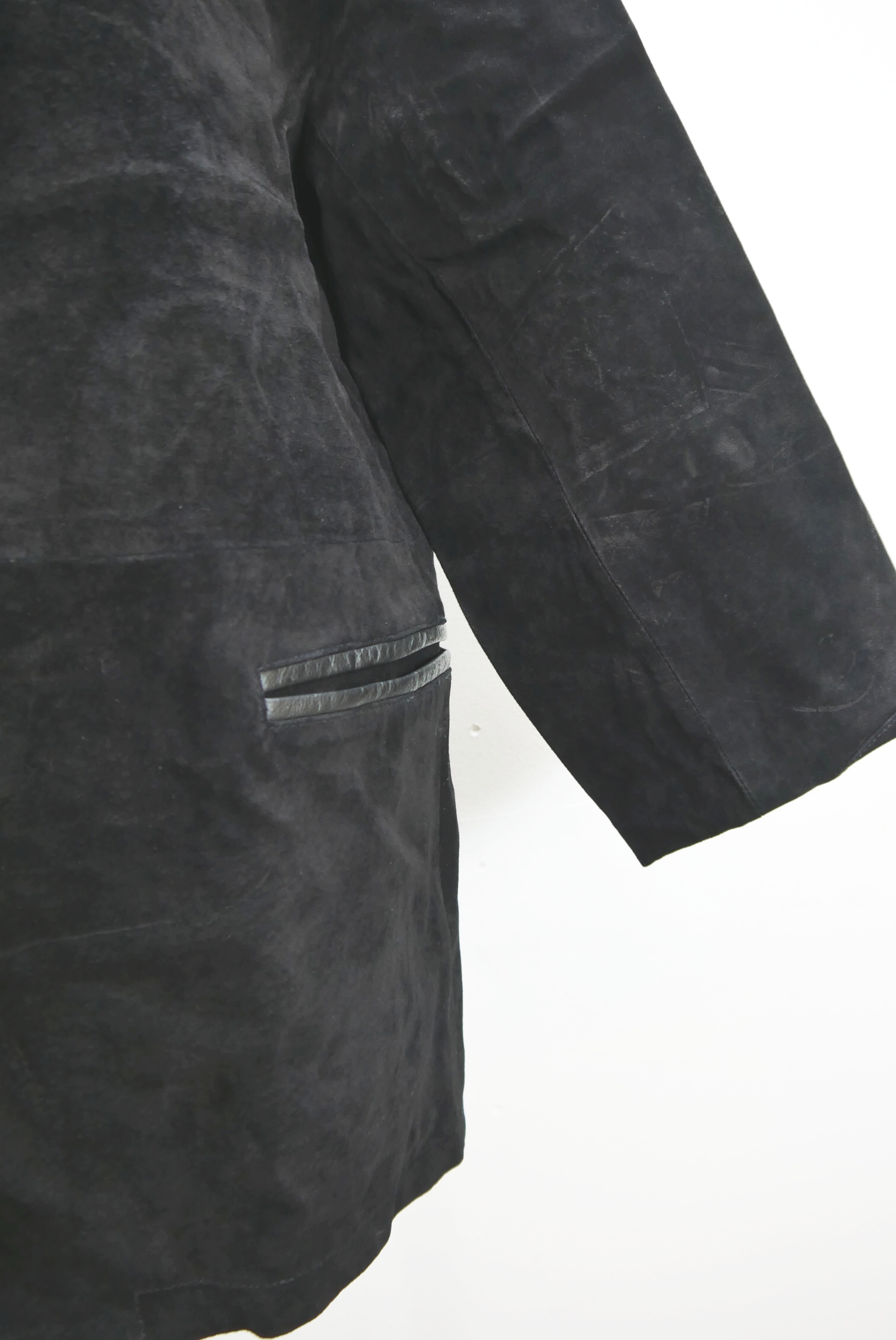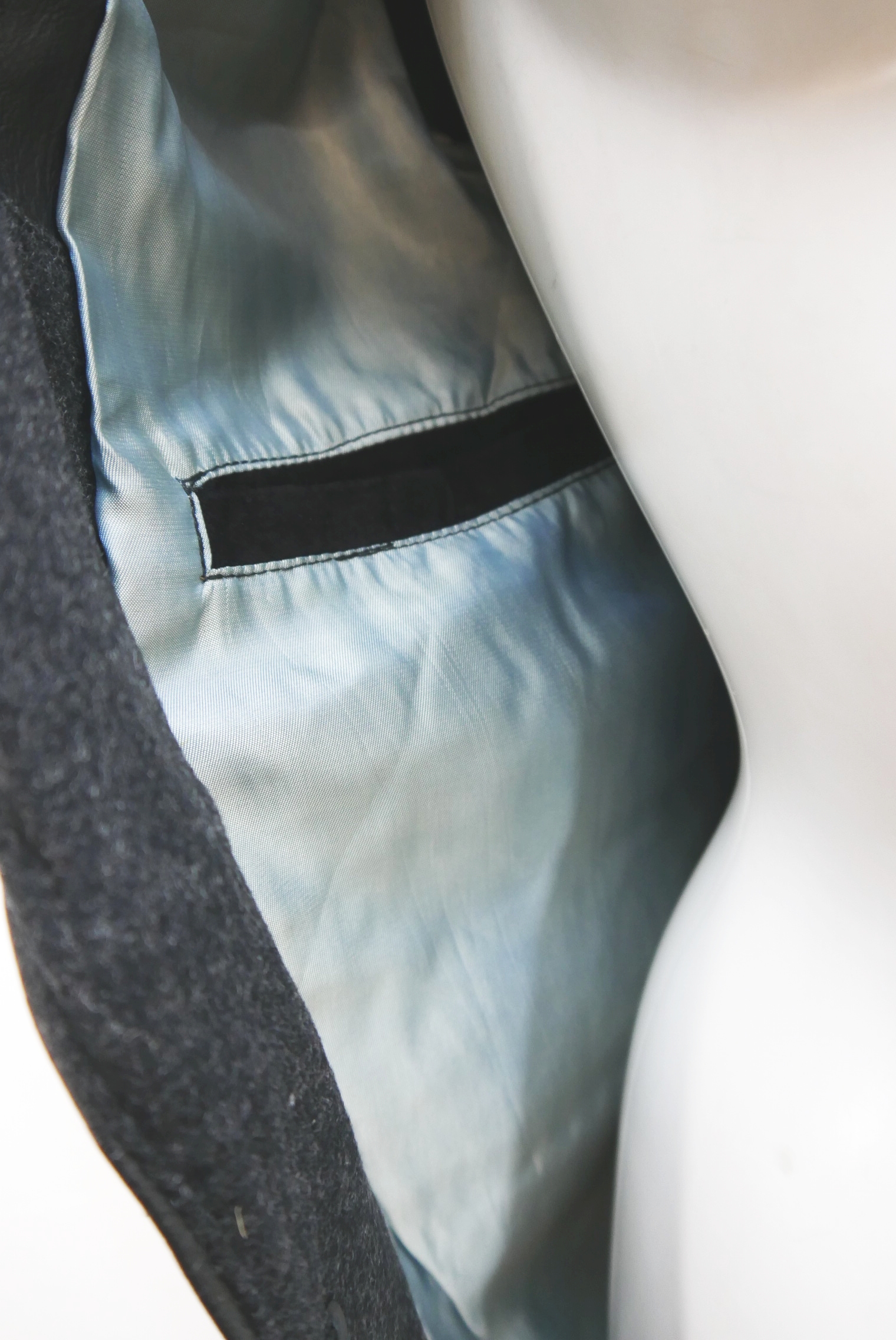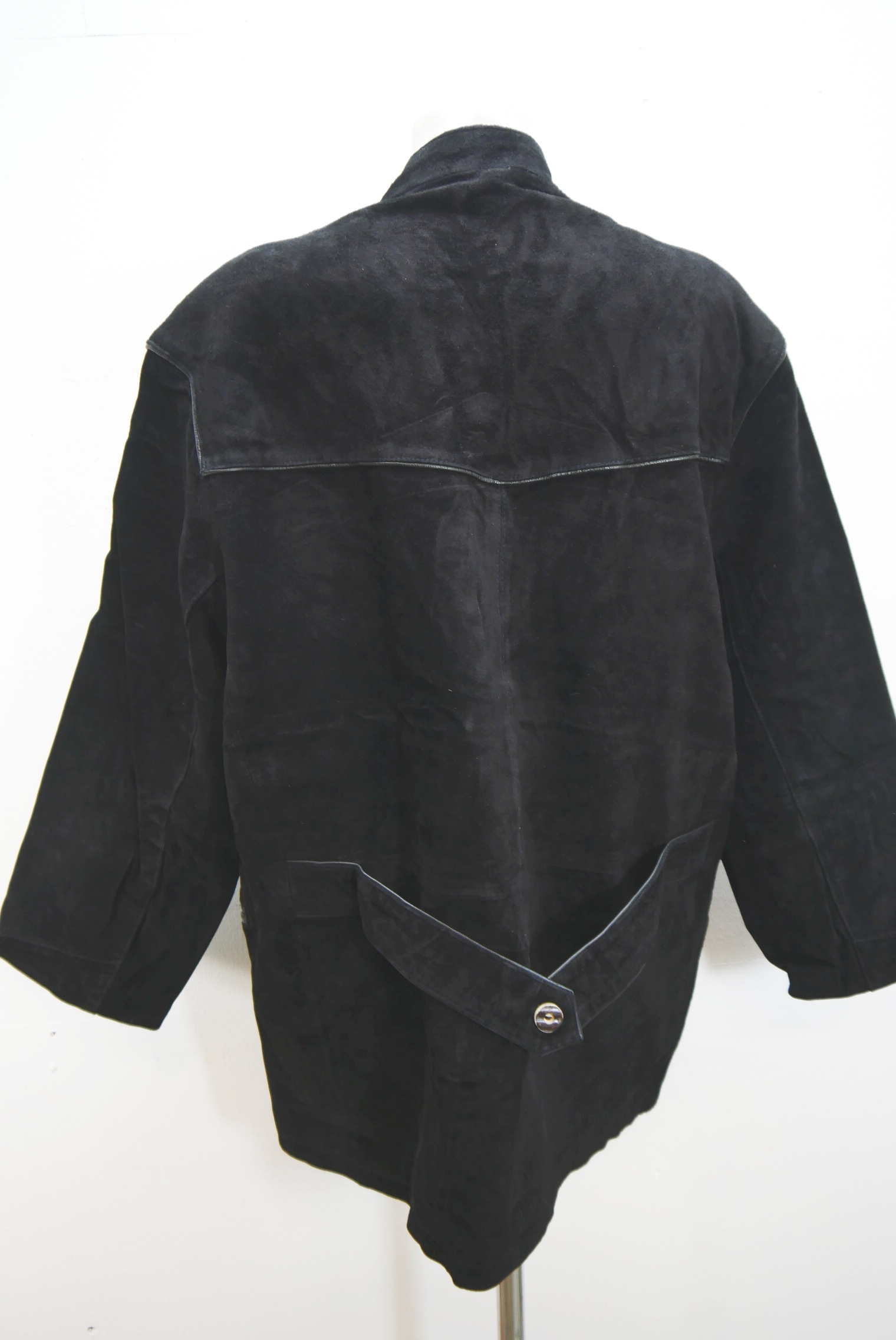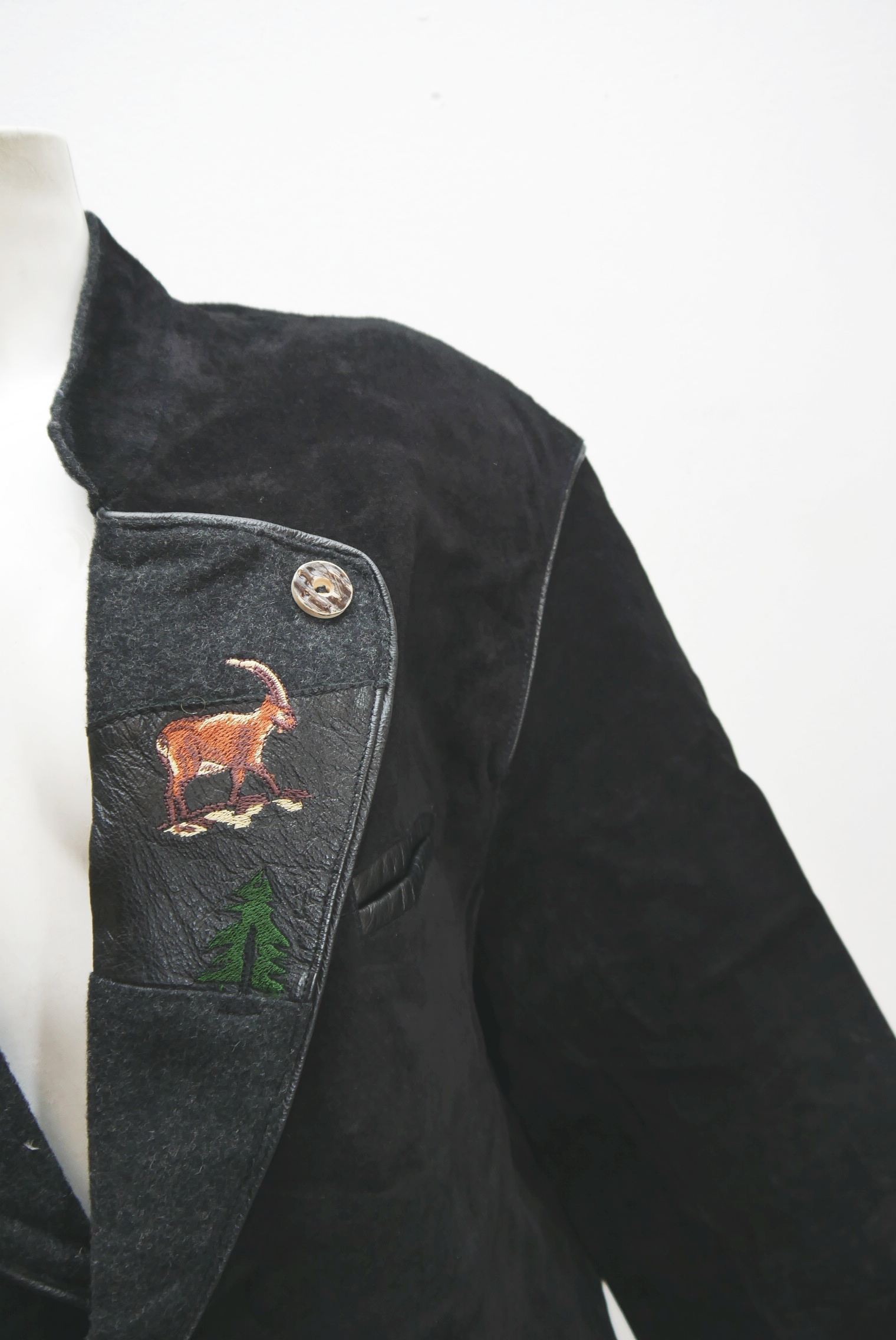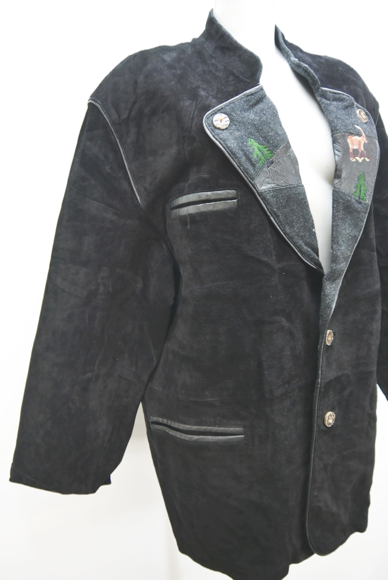 Lässig lange dicke schwere 90er Vintage Lederjacke als Trachtenjacke Janker neuwertig, sehr kurze Ärmel weit geschnitten und markenlos aus Rindsleder gefertigt weich in schwarz und nicht verspeckt, innen gefüttert mit Stickerei verziert als langarm Jacke mit klasse Knöpfen, – wird meistens offen getragen.