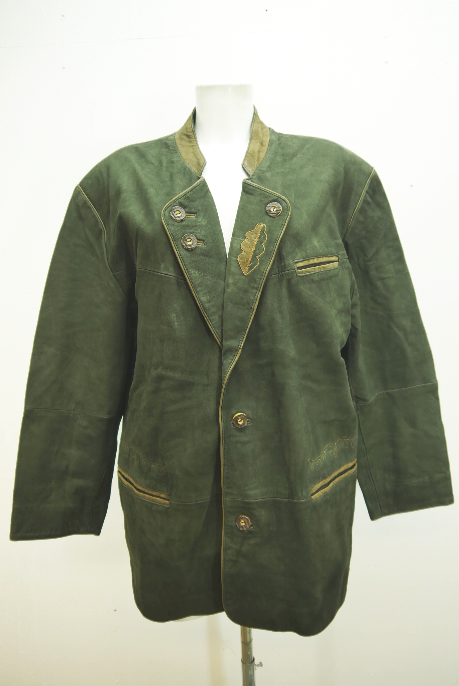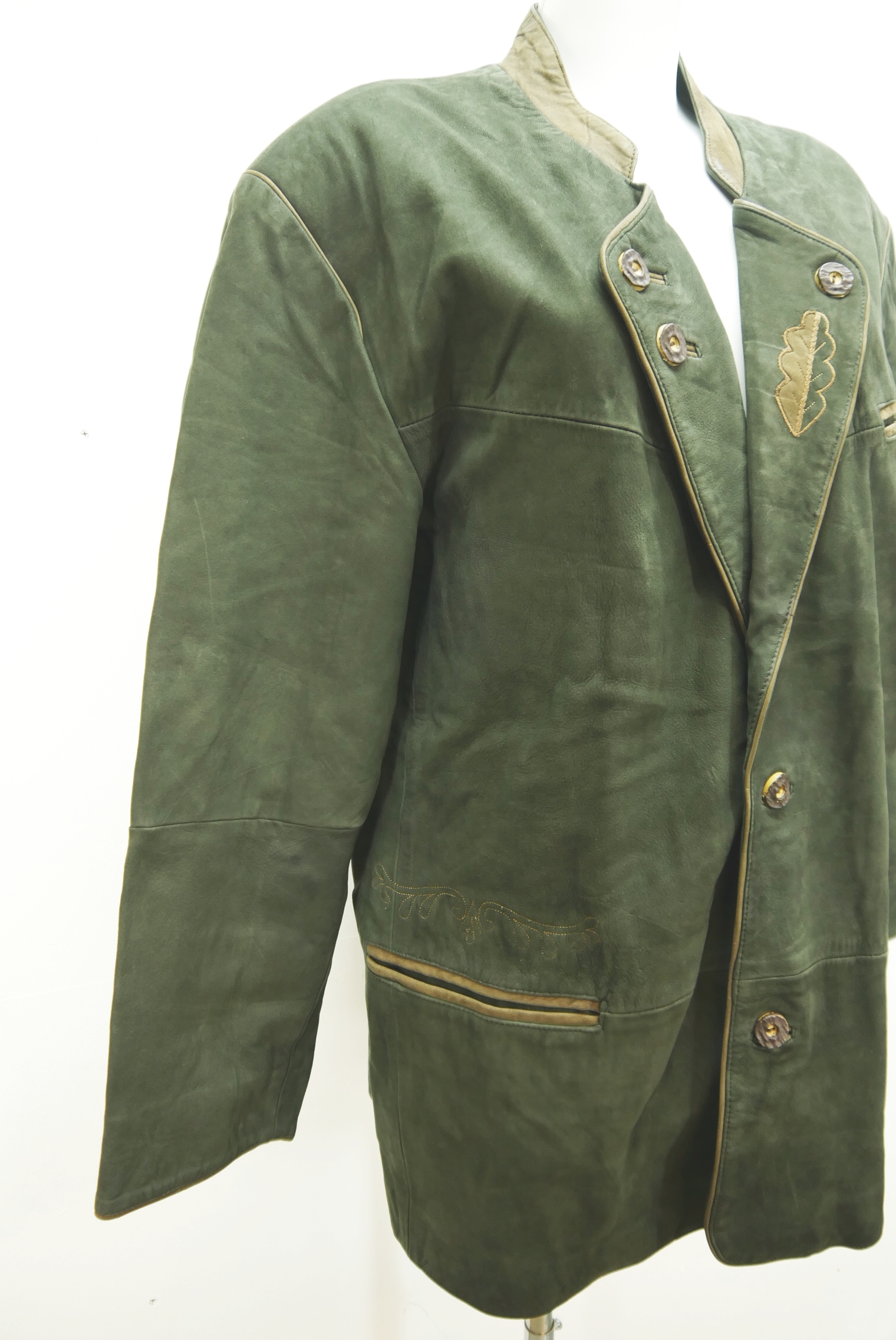 Lange lässige 90er Vintage Lederjacke weit geschnitten als Trachtenjacke markenlos aus weichen Schafsleder in graugrün, kaum speckig doch innen gefüttert schön mit dezenter Stickerei und Besatz verziert, mit Revers als langarm Jacke mit Kunststoffknöpfen, – wird meistens offen getragen.