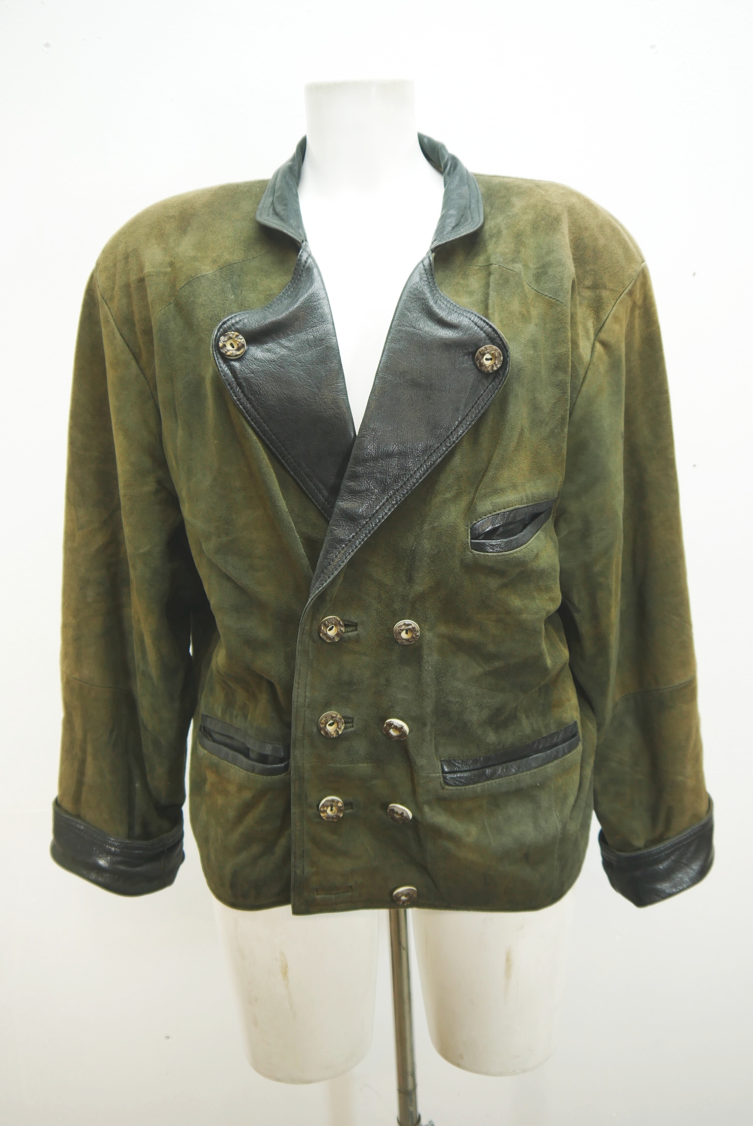 Lange lässige 90er Vintage Lederjacke weit geschnitten als Trachtenjacke markenlos aus Schweinsleder in graugrün, wenig speckig und innen gefüttert schön mit dezenter Stickerei verziert und mit Revers als langarm Jacke mit Kunststoffknöpfen, – wird meistens offen getragen.