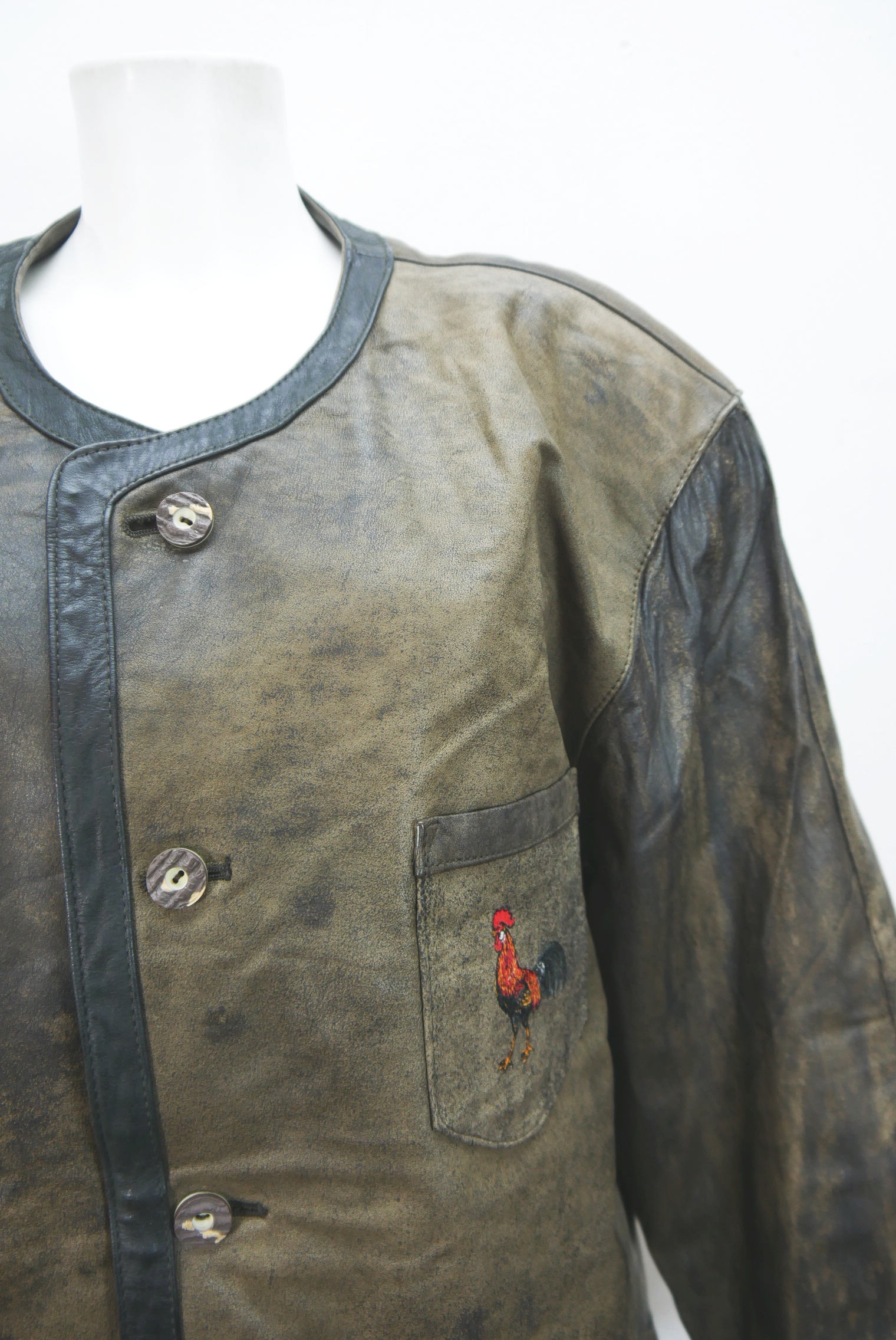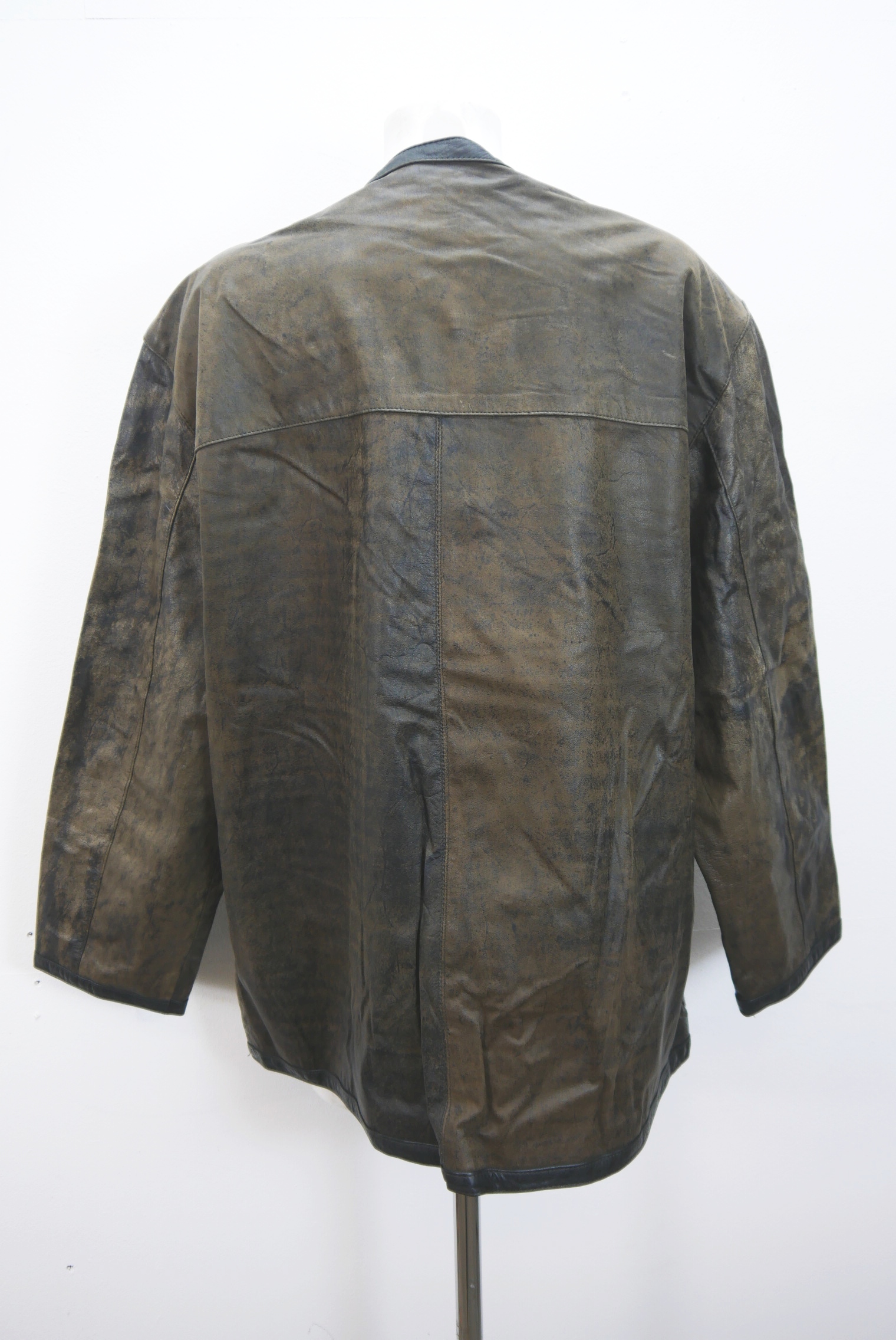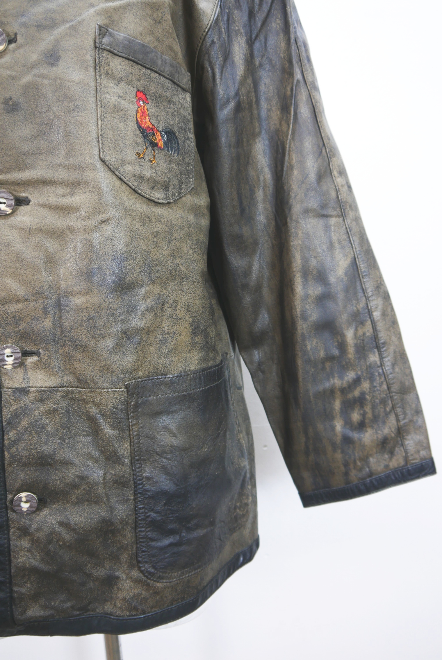 Lässig lange Vintage Lederjacke als Trachtenjacke Janker in Top Zustand und weit geschnitten von New Fast aus Rindnappa Glattleder in Antik-Look gefertigt schön weich in braun und leicht verspeckt, innen gefüttert mit Stickerei auf der Brusttasche verziert als langarm Jacke mit klasse Knöpfen, – wird meistens offen getragen.