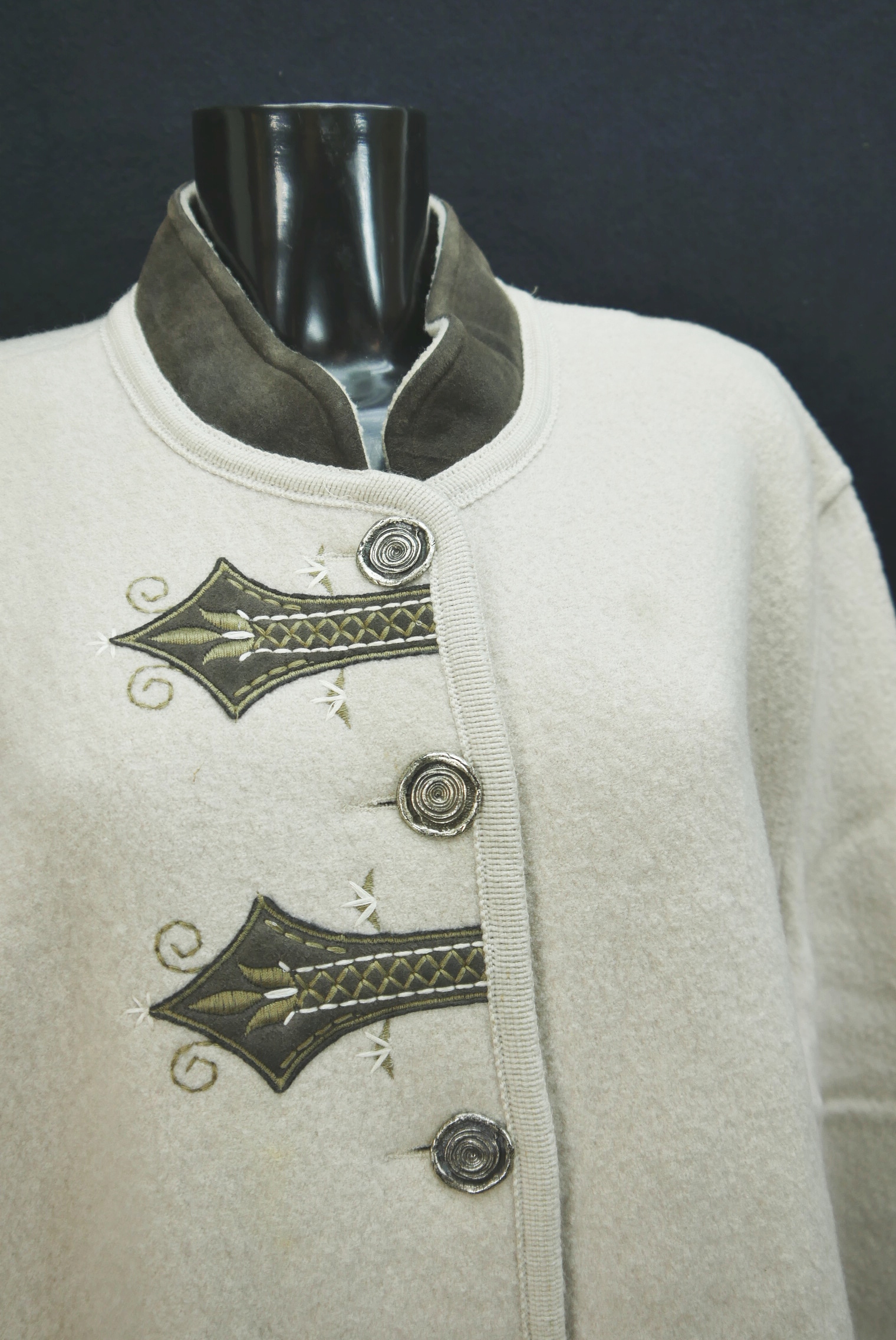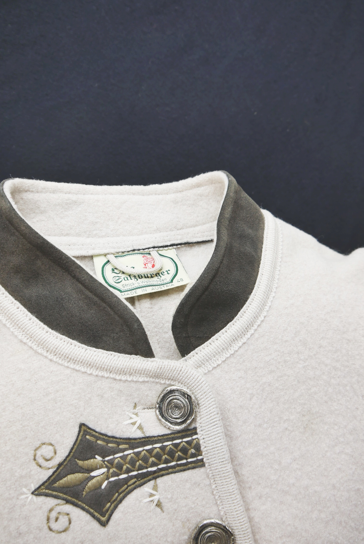 Lange leichte warme Vintage Walkjacke neuwertig als Trachtenjacke hochwertig von Salzburger aus reiner Schurwolle gestrickt in grau innen nicht gefüttert und schön mit Stickerei Besatz verziert als langarm Jacke mit klasse Knöpfen.