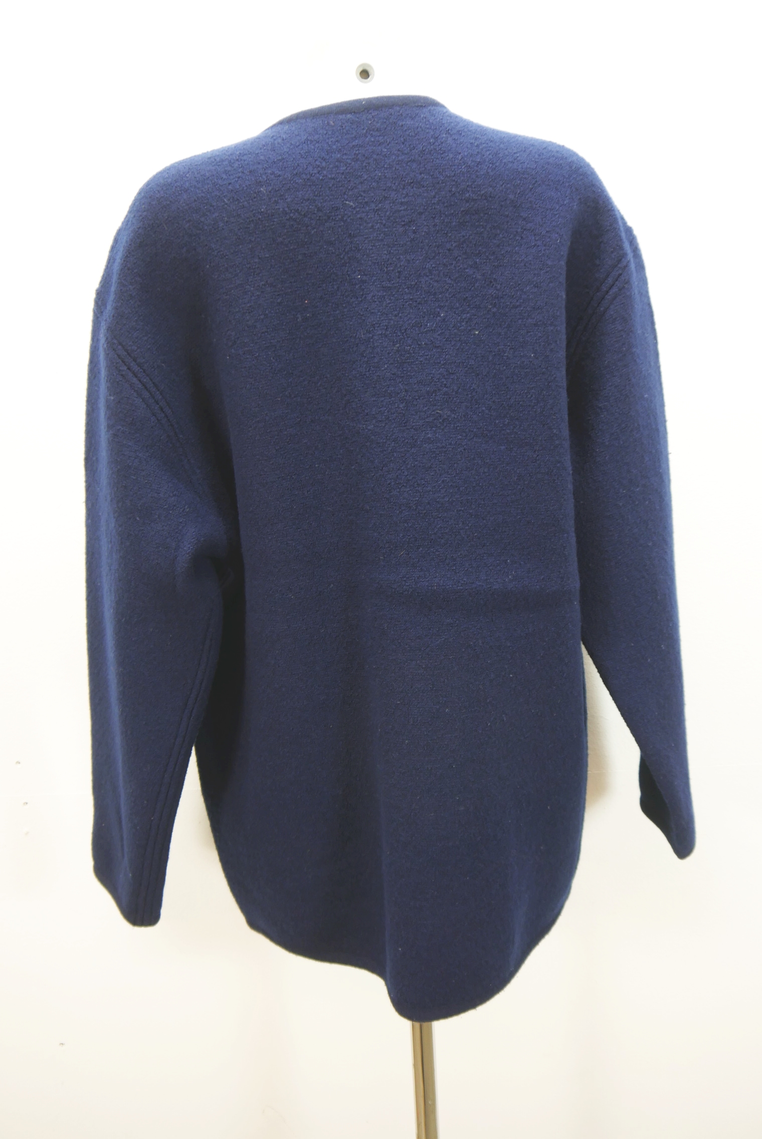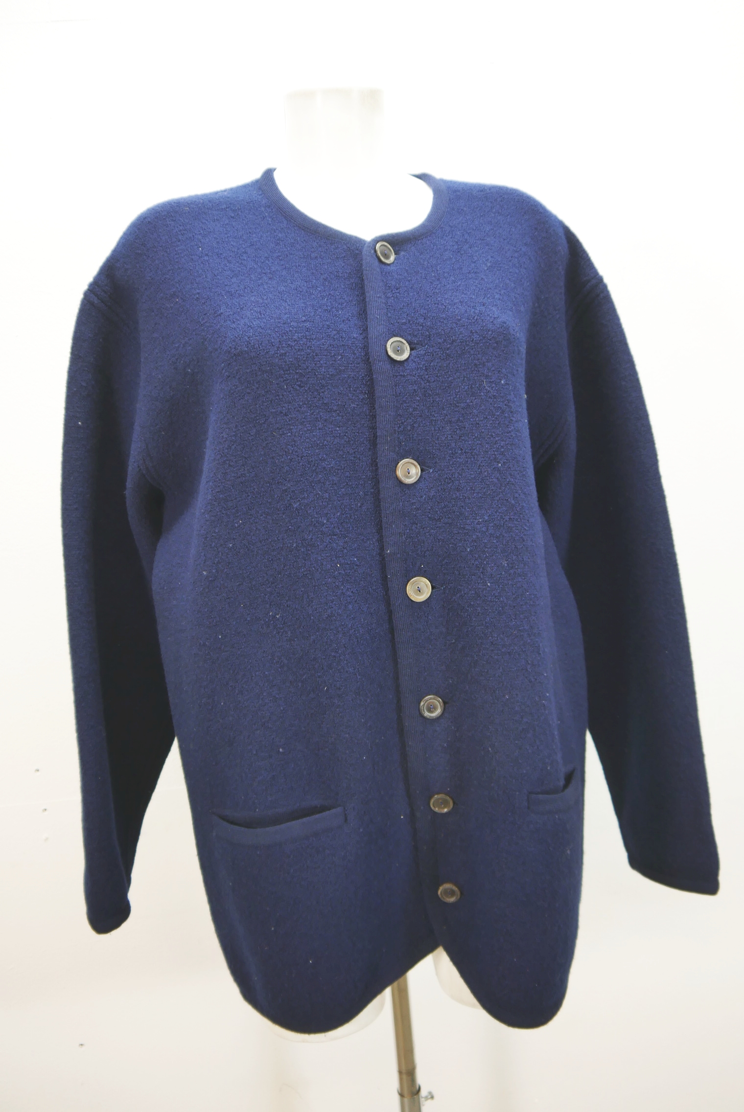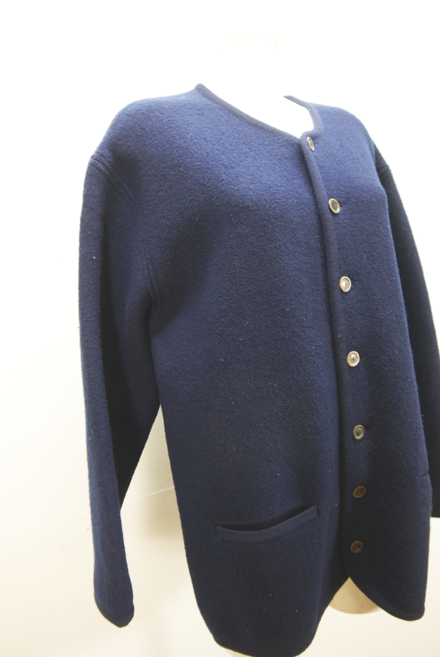 Schlichte dicke 90er Vintage Walkjacke bequem weit geschnitten als Trachtenjacke hochwertig und markenlos aus Schurwolle gewalkt in blau, innen nicht gefüttert schön schlicht ohne Verzierungen als langarm Jacke mit klasse Knöpfen.