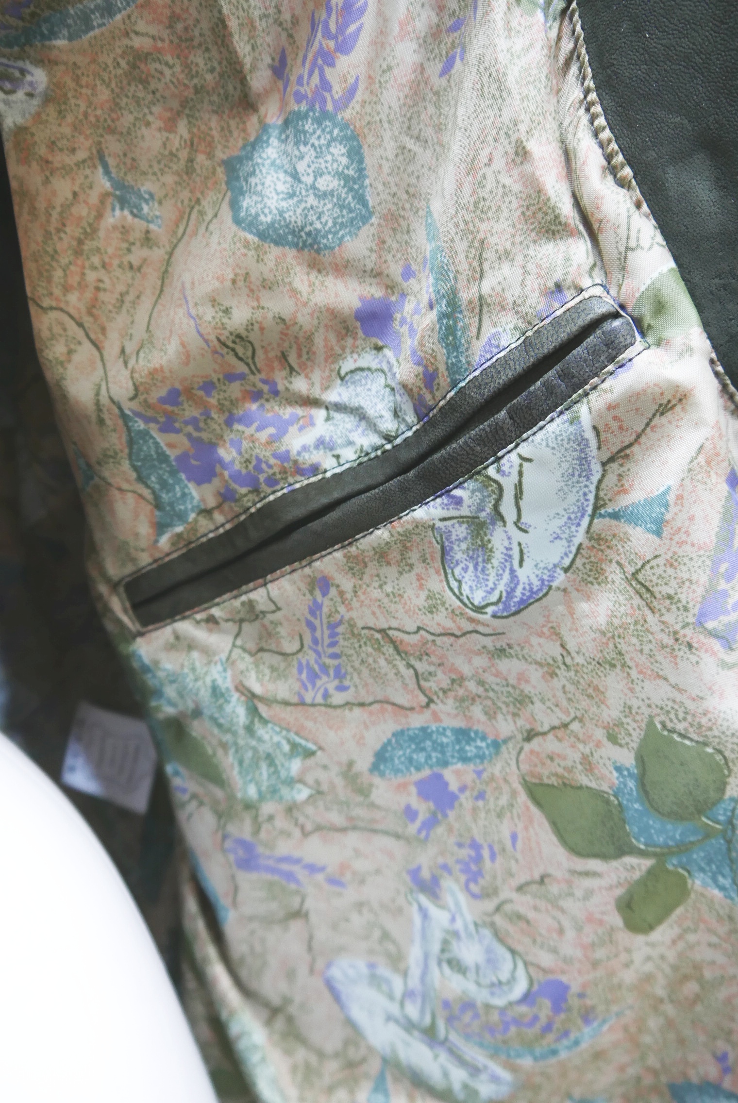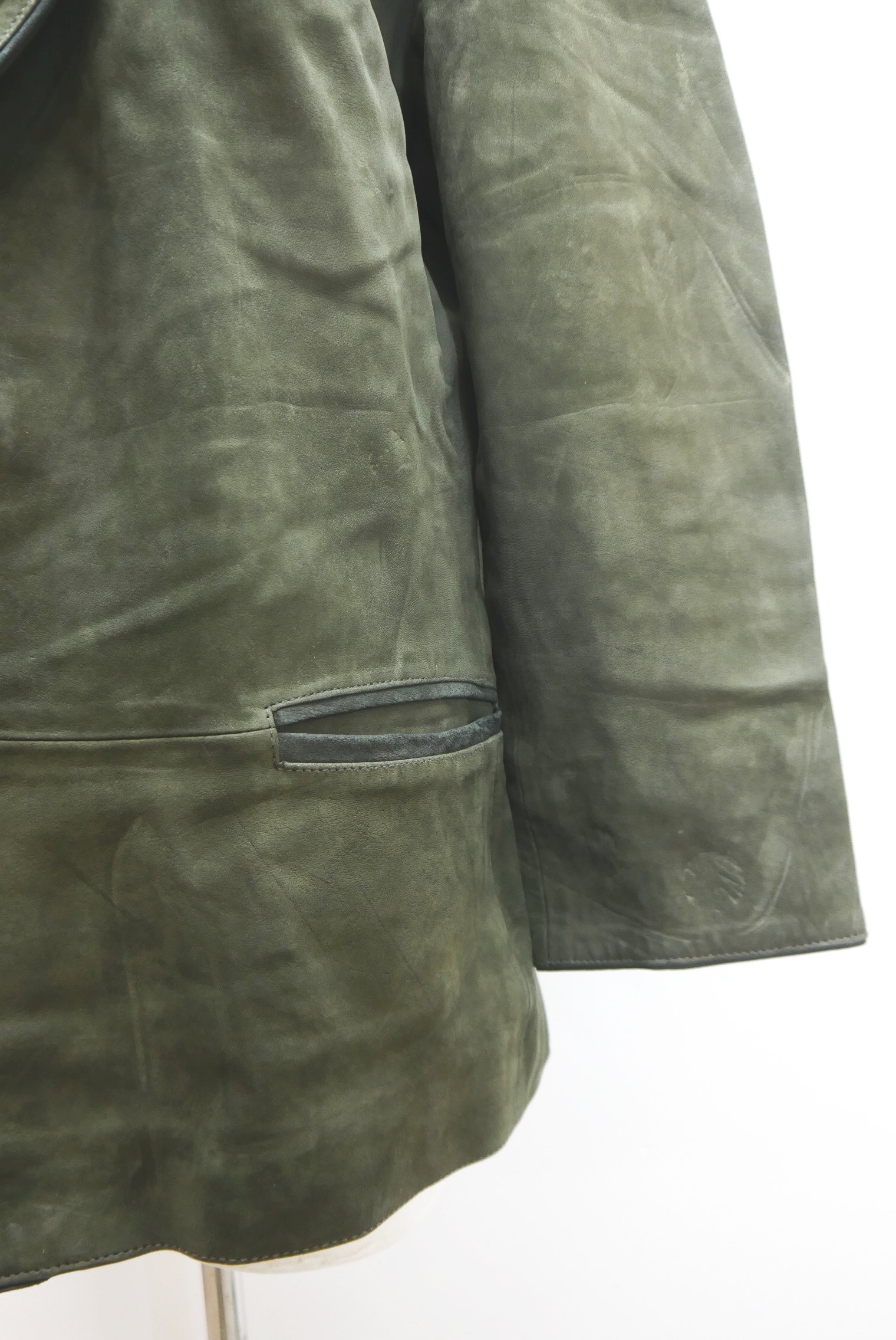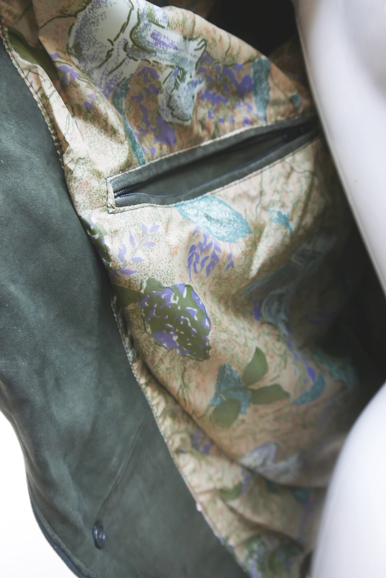 Lässige lange Vintage Lederjacke als Trachtenjacke Janker in Top Zustand markenlos dickes Ziegenleder schön weich in grün, lederypisch leicht verspeckt und innen gefüttert schön mit Stickerei auf dem Revers als langarm Jacke mit klasse Knöpfen, – wird meistens offen getragen.