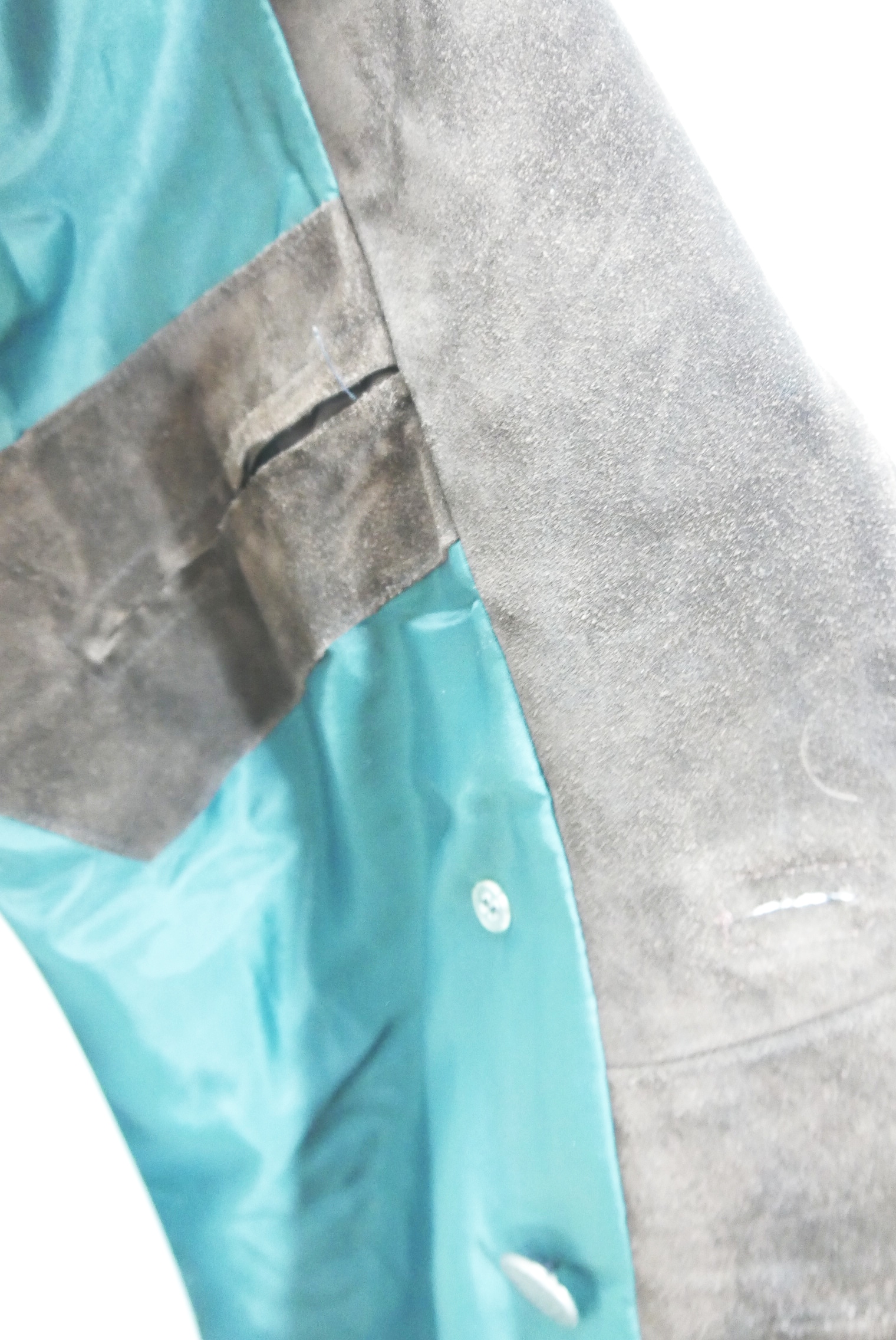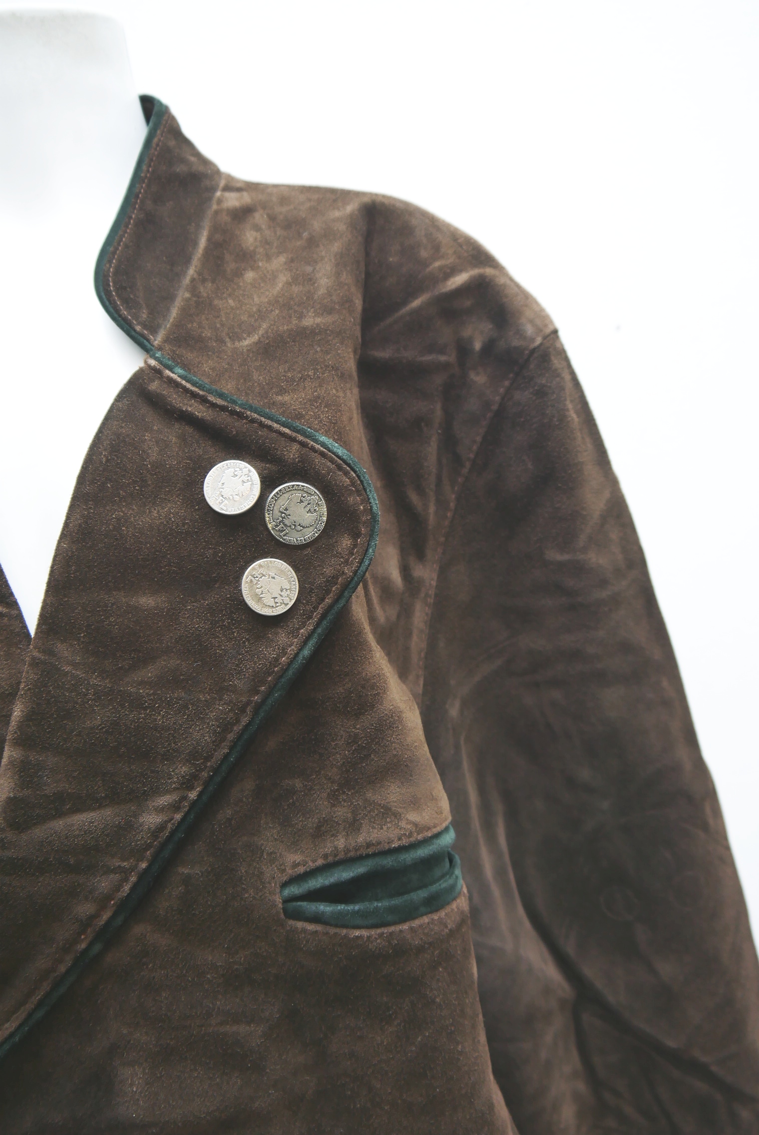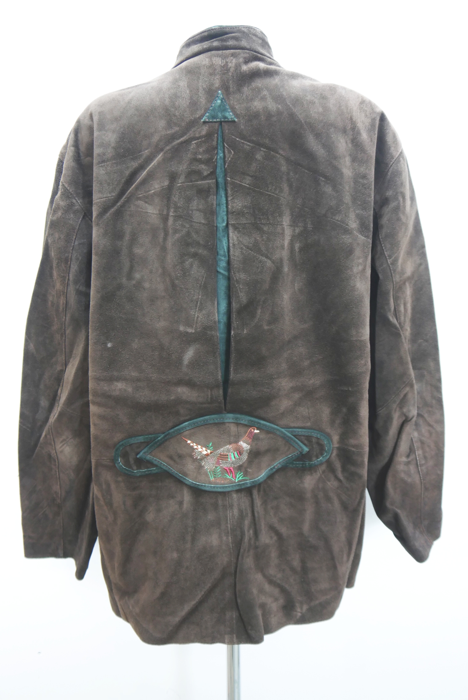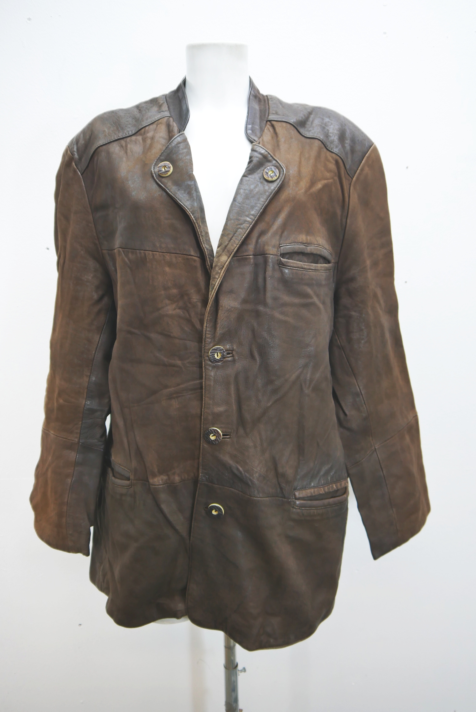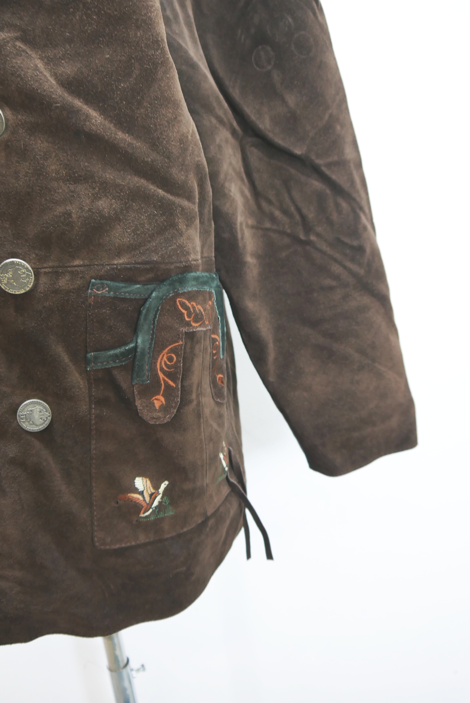 Lässig lange 90er Vintage 2 Reiher Lederjacke als Trachtenjacke Janker neuwertig weit geschnitten und markenlos aus Rindleder Velourleder gefertigt schön weich in braun und nicht verspeckt, innen gefüttert mit Stickerei verziert als langarm Jacke mit klasse Knöpfen, – wird meistens offen getragen.