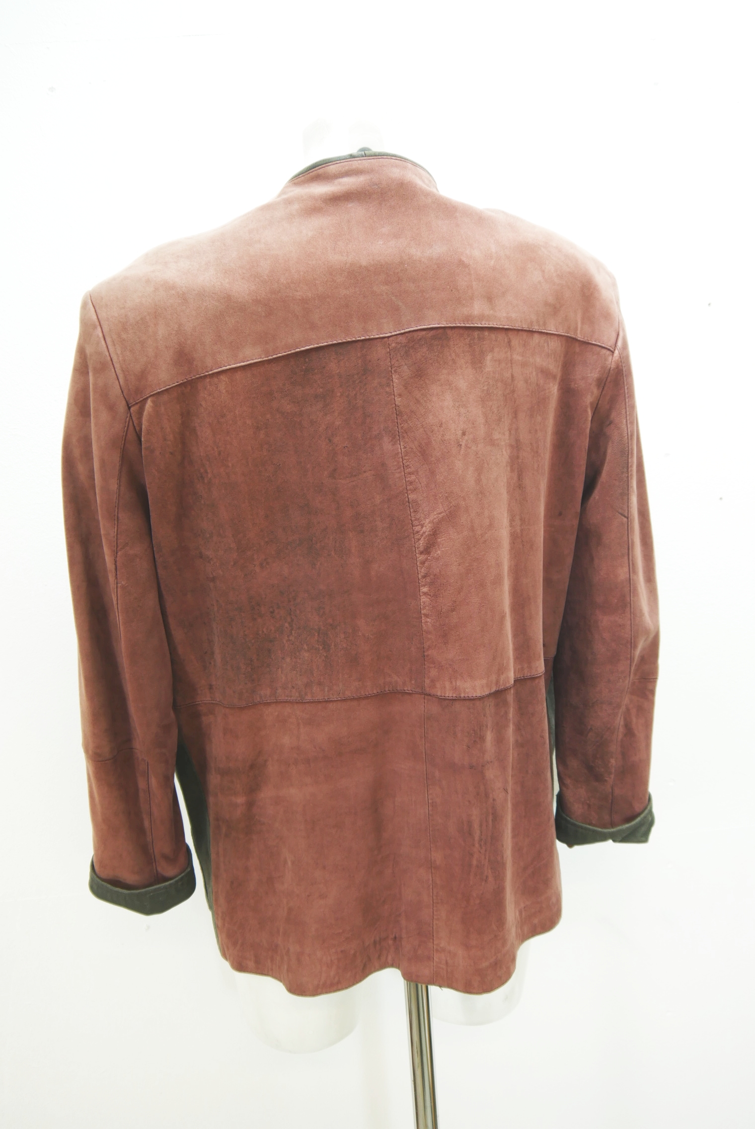 Lässig lange Vintage Trachtenjacke als Blazer Lederjacke schön eingetragen und gerade geschnitten Trachten Janker markenlos aus Wildleder gefertigt in rostrot und leicht verspeckt, innen gefüttert mit Besatz auf den Taschen verziert als langarm Jacke mit schönen Knöpfen,- wird meistens offen getragen.