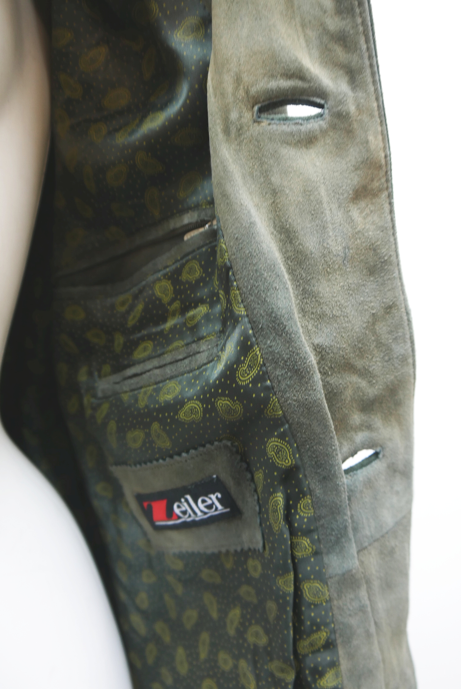 Lange lässige 90er Vintage Lederjacke leicht tailliert geschnitten als Trachtenjacke von Zeiler hochwertig aus weichen Ziegenleder in grau grün, nicht speckig doch innen gefüttert schön mit dezente Stickerei verziert ohne Revers als langarm Jacke mit evtl. echten Hirschhornknöpfen, – wird meistens offen getragen.
